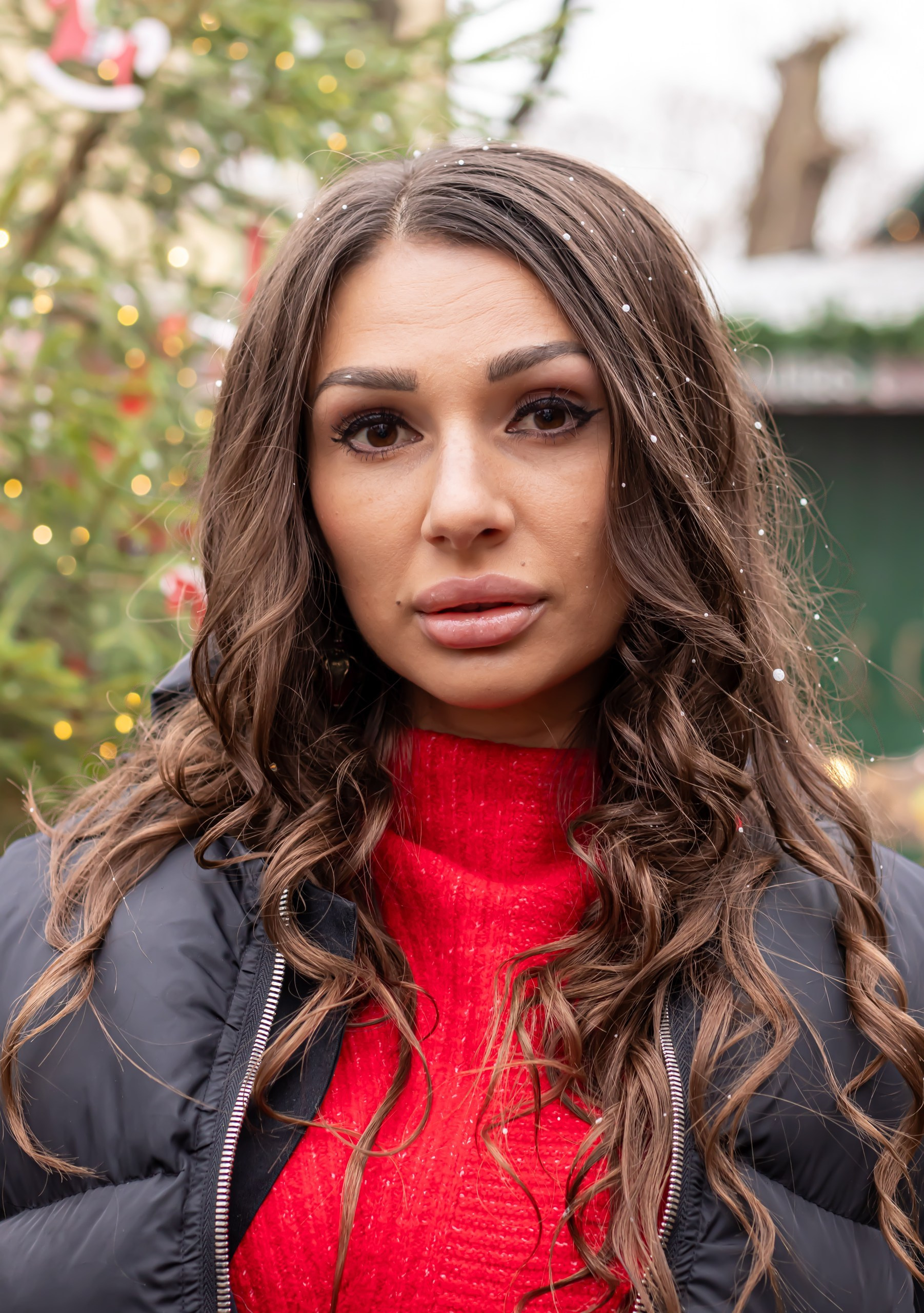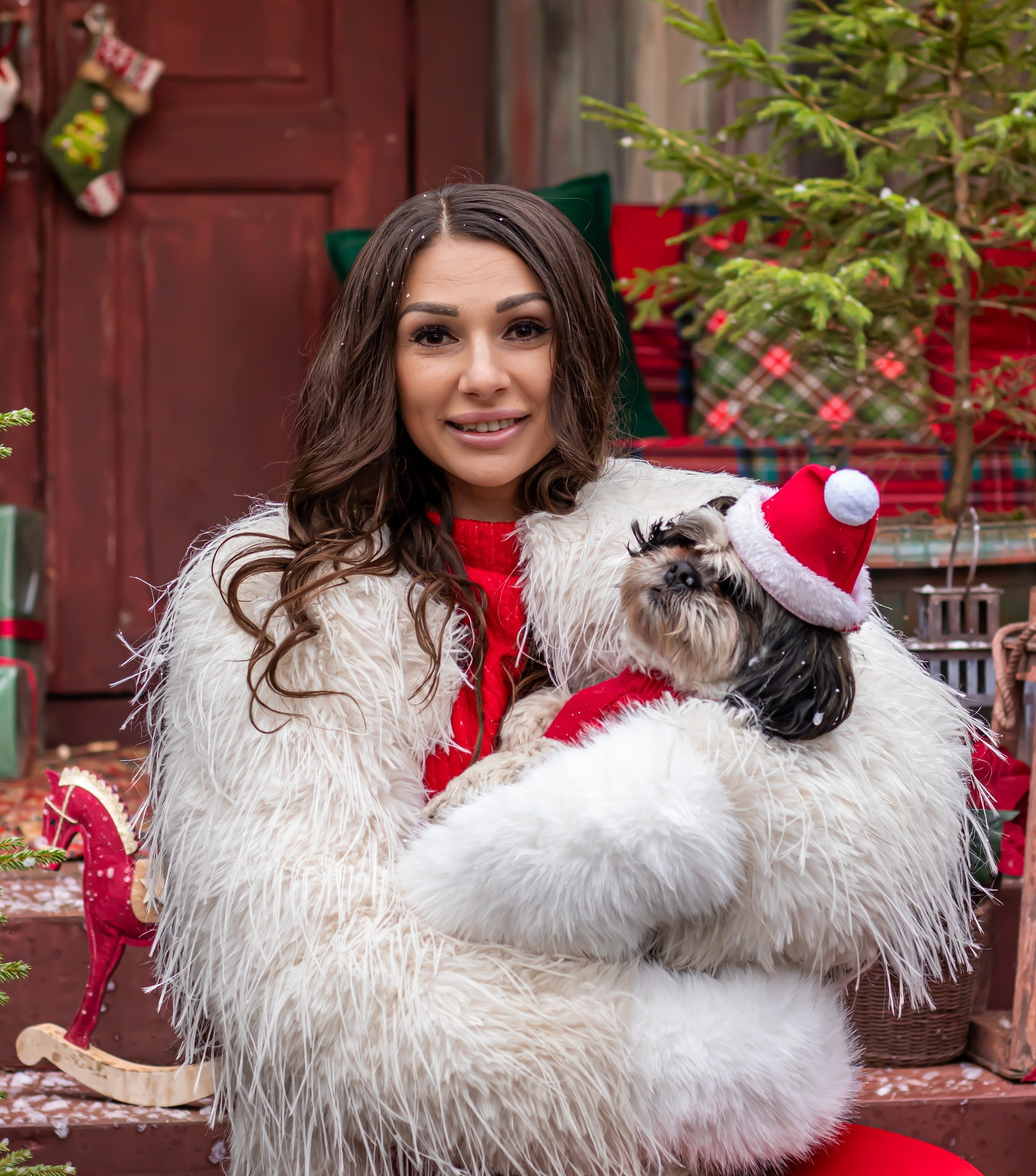 Съёмка получилась эмоциональной и разнообразной: кадры с лыжами, снежный эффект, прогулка по локации, фото у шале, портреты с мягким боке, а также трогательные моменты с её маленькой собакой в новогоднем наряде. Такие детали делают серию живой, искренней и очень тёплой — несмотря на зимний сюжет.