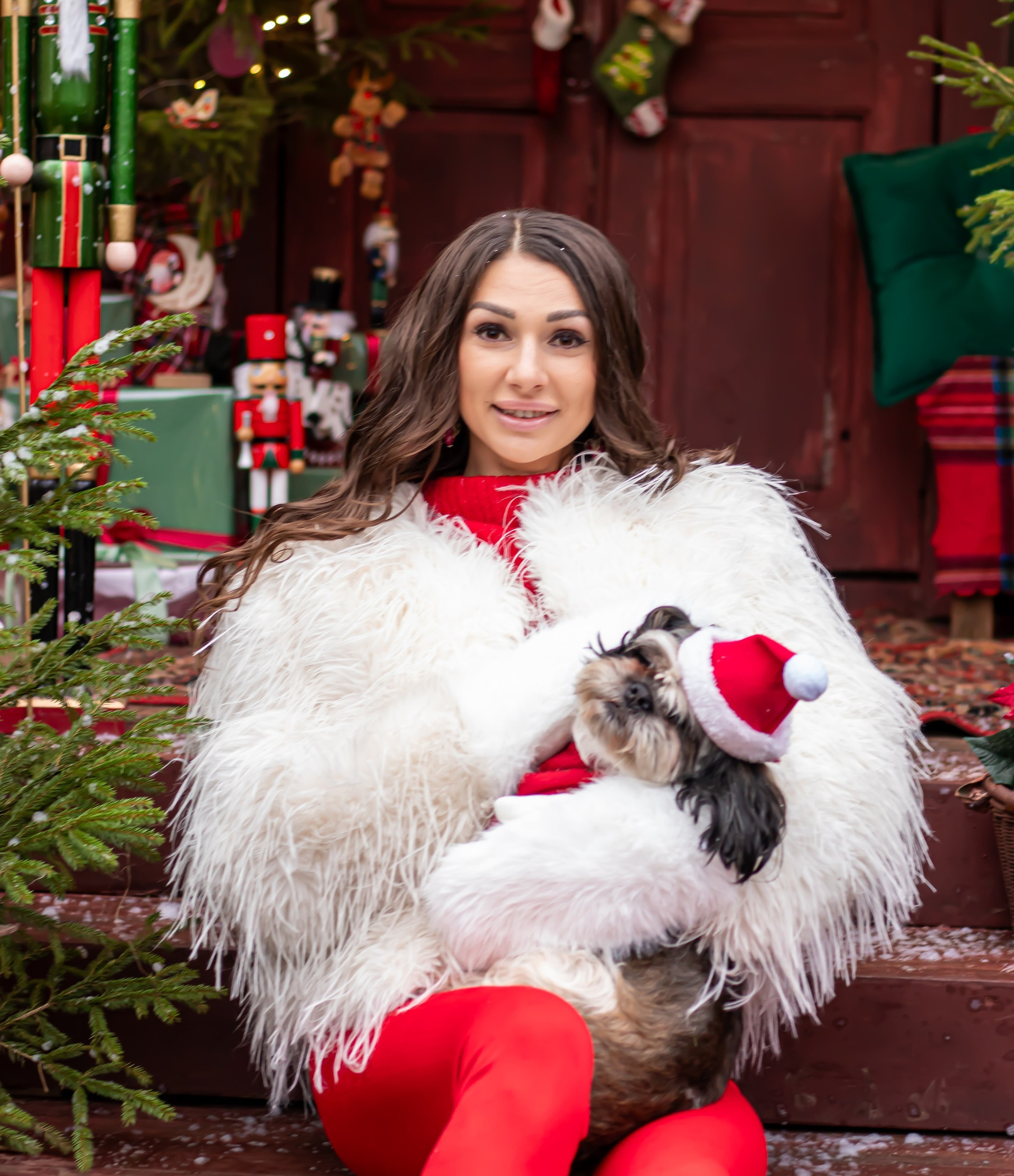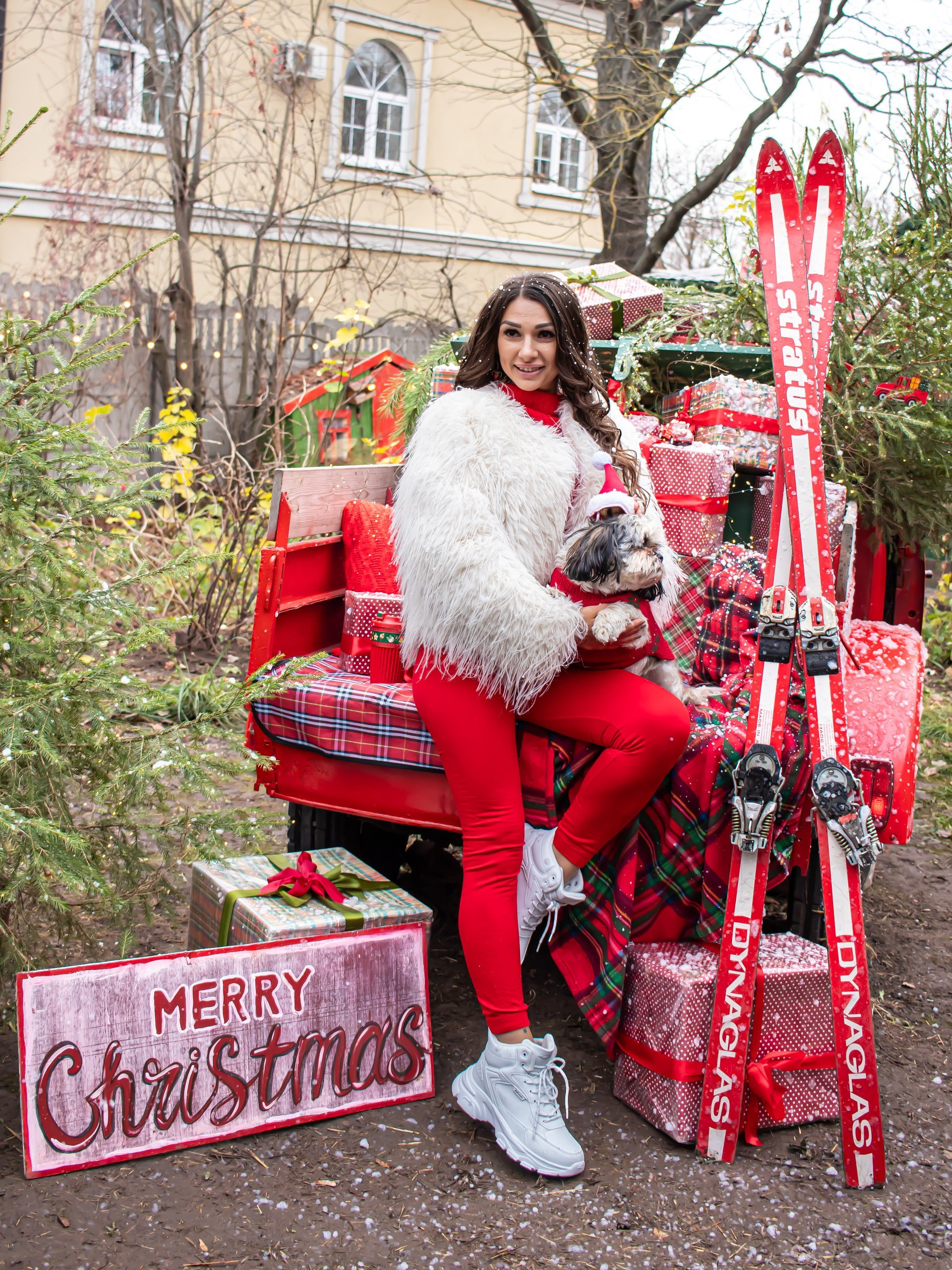 — яркую, стильную и завораживающую. Локация оформлена как рождественское шале: еловые композиции, подарки, красные акценты, ретро-сани, гирлянды и мягкий свет создают ощущение настоящей зимней сказки. В центре съёмки — молодая девушка в эффектном образе: красный костюм, пушистая белая шуба и зимние аксессуары, которые идеально вписываются в праздничную палитру.