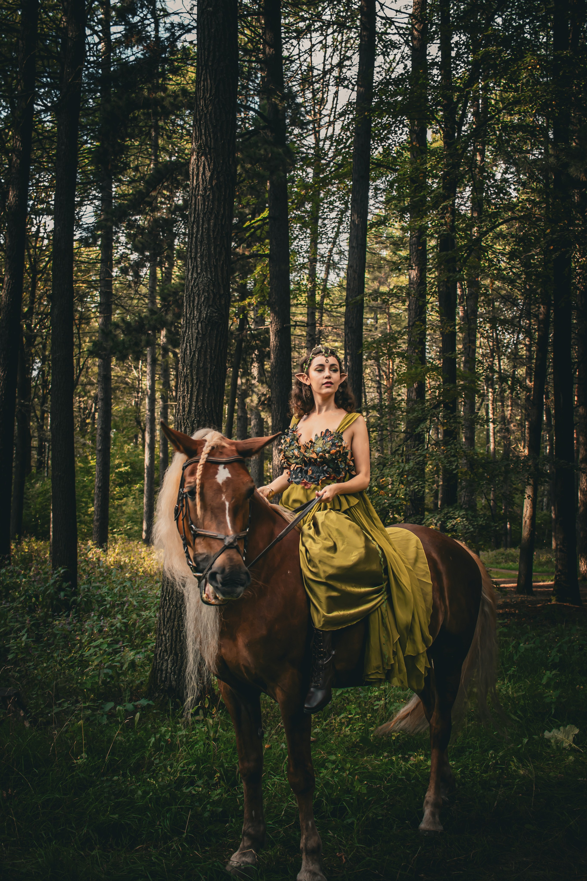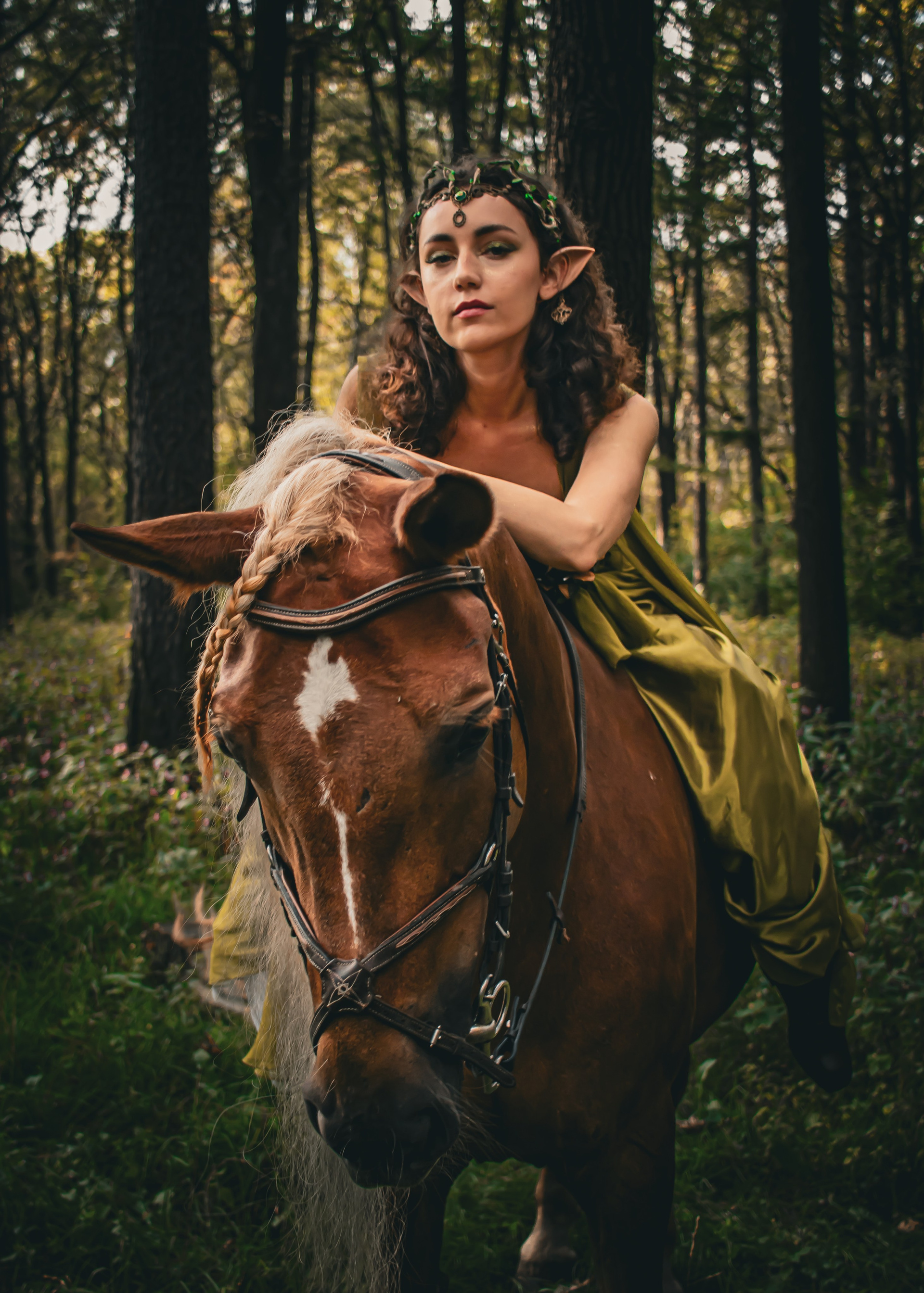 Лес наполнился мягким светом, шорохом листвы и дыханием лошади, а героиня в эльфийском наряде стала частью природы.