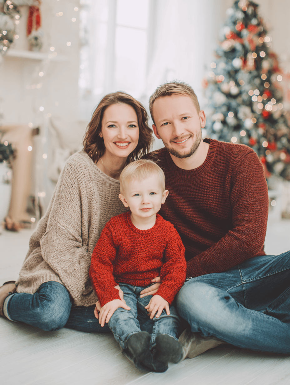 Если хочется не нежных пастельных оттенков, а ярких, праздничных кадров, выбирайте 1–2 основных цвета (например, красный + кремовый, синий + белый, изумруд + золото) и поддерживайте их в одежде всей семьи и декоре. Так кадр остаётся нарядным, но не перегруженным.