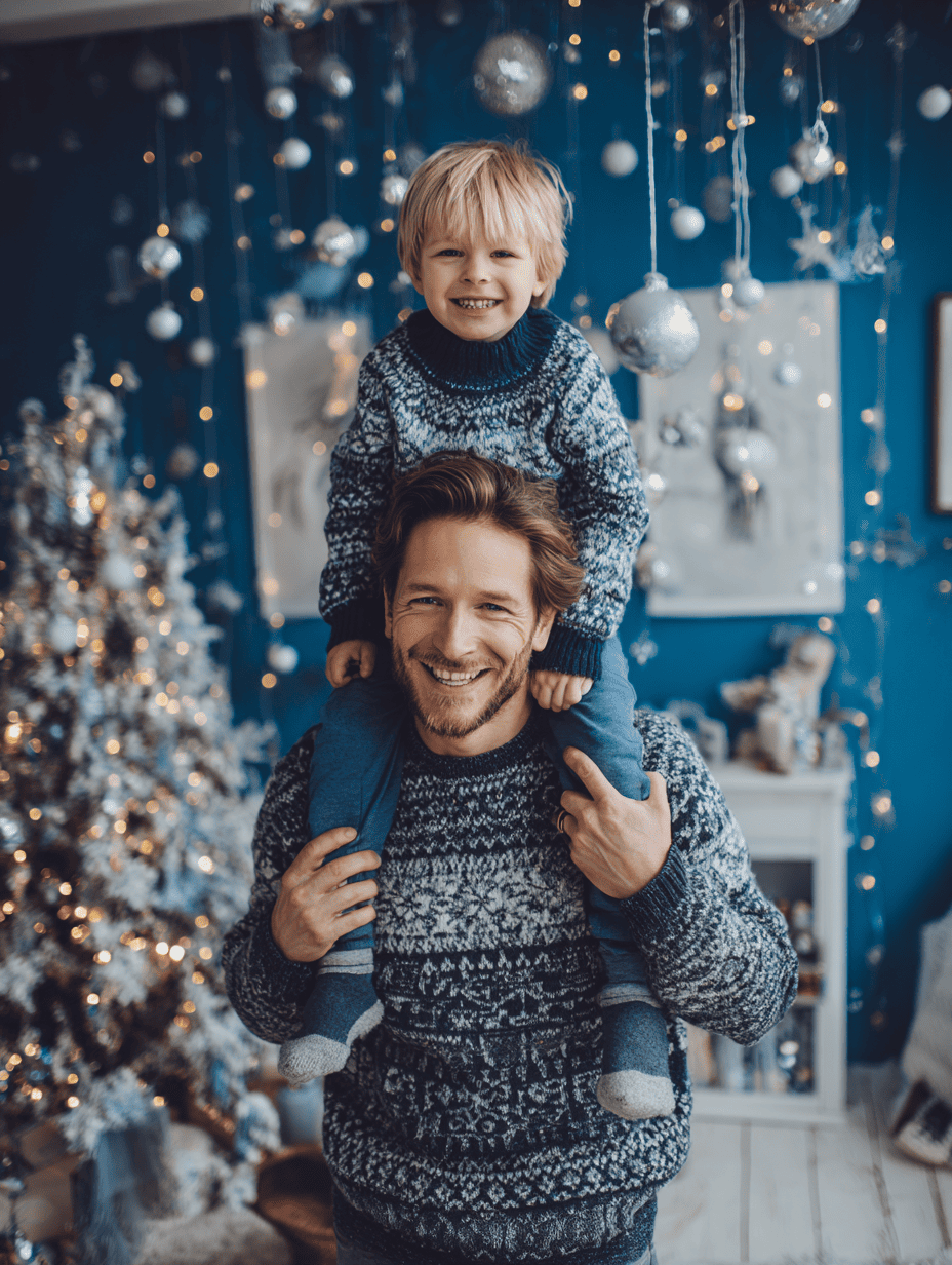 - Папа: рубашка или свитер без принтов, базовые цвета (белый, молочный, серый, графитовый, глубокий зелёный), аккуратные джинсы или брюки.