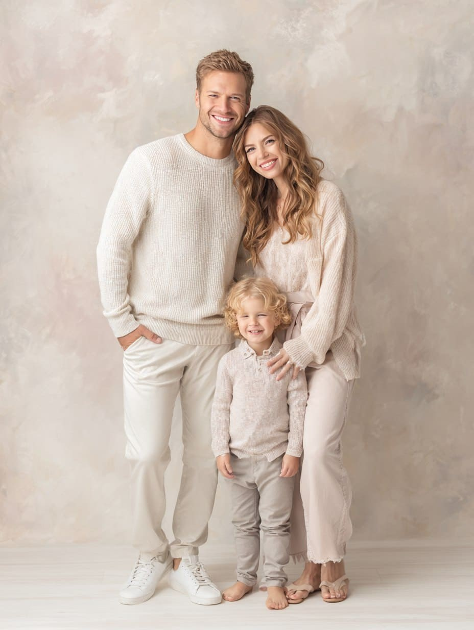 - Старайтесь избегать кричащих принтов и «радужных» сочетаний: так семейный кадр выглядит дороже и спокойнее.