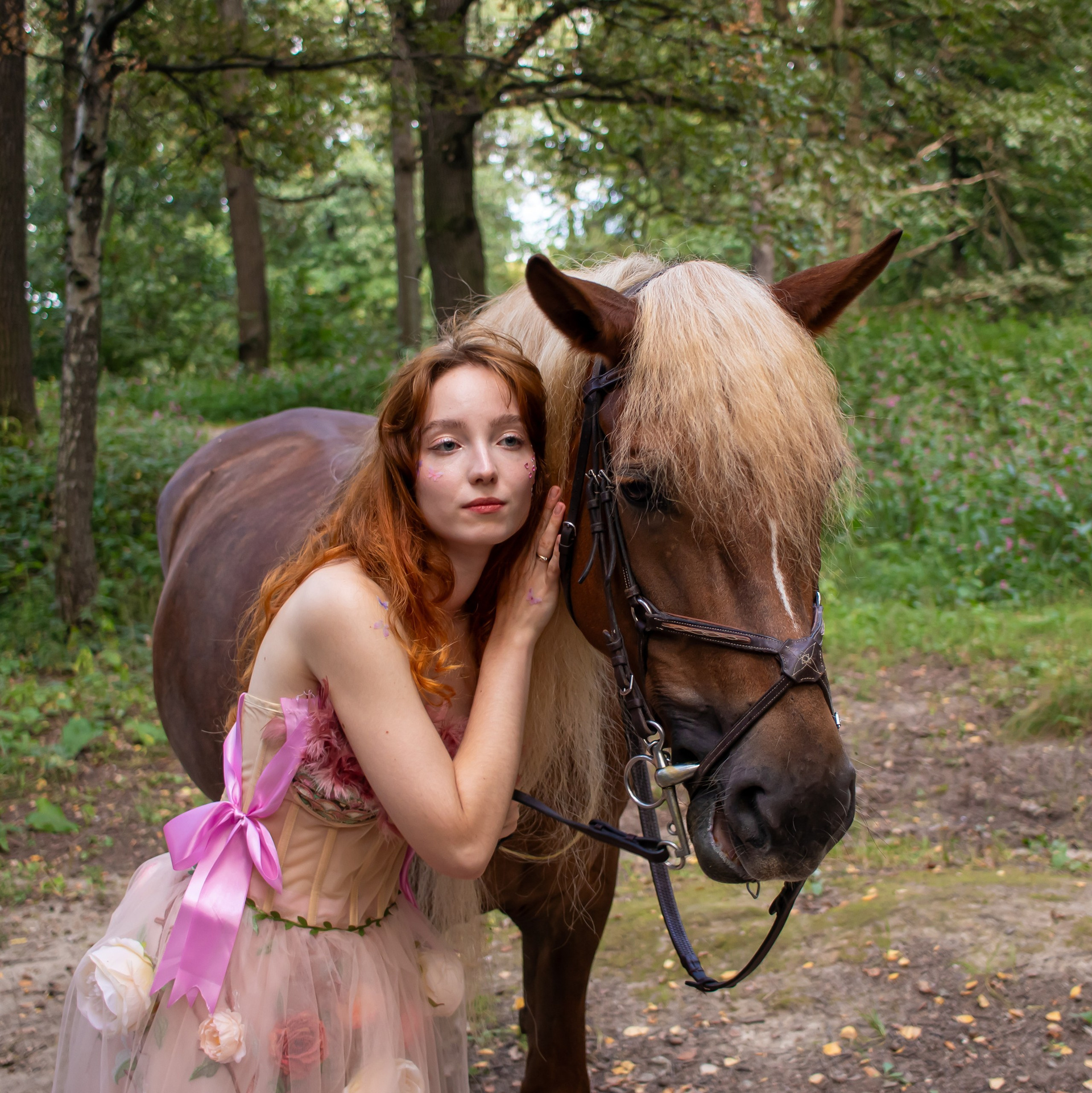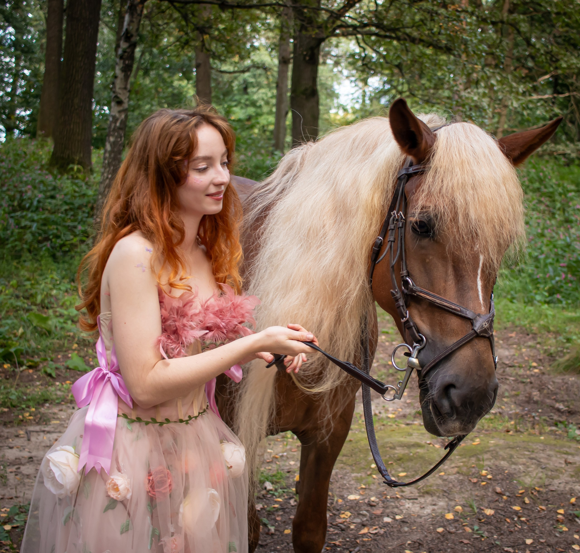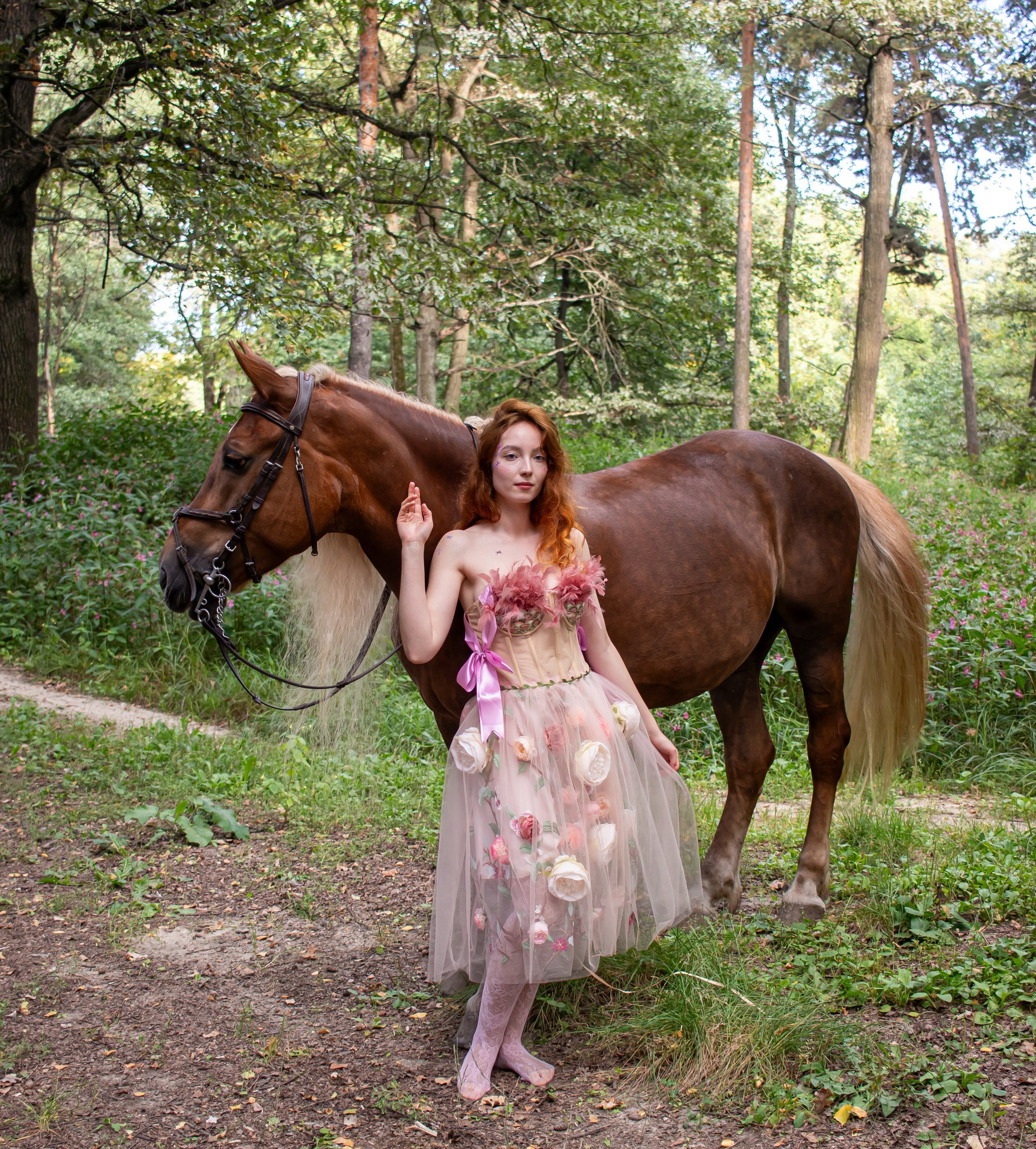 Алина — в образе нимфы, среди цветов и шороха листвы, рядом с благородным конём