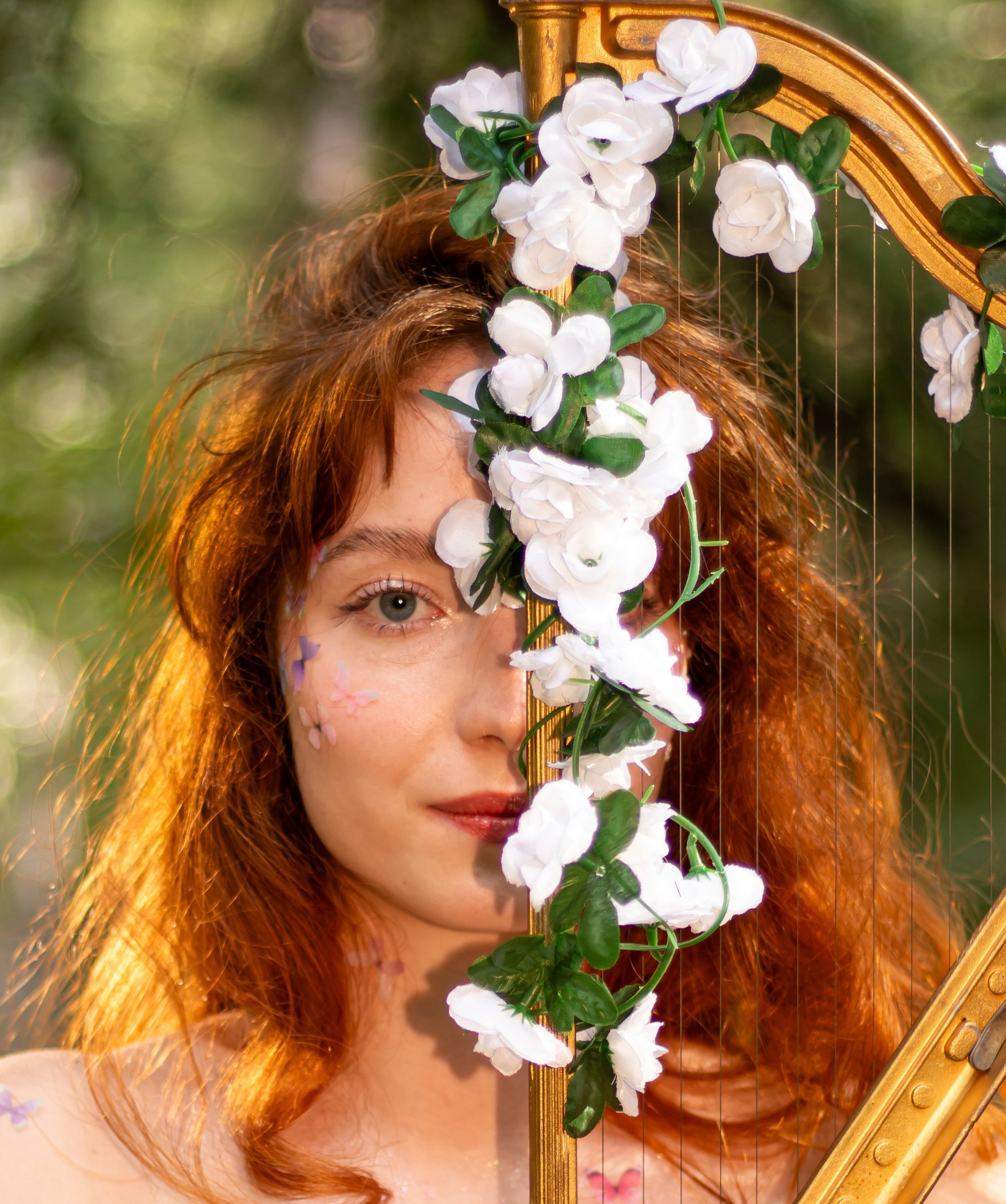 Цветочное платье, живая арфа, лошадь и солнечные лучи между ветвей создают особое ощущение волшебства.