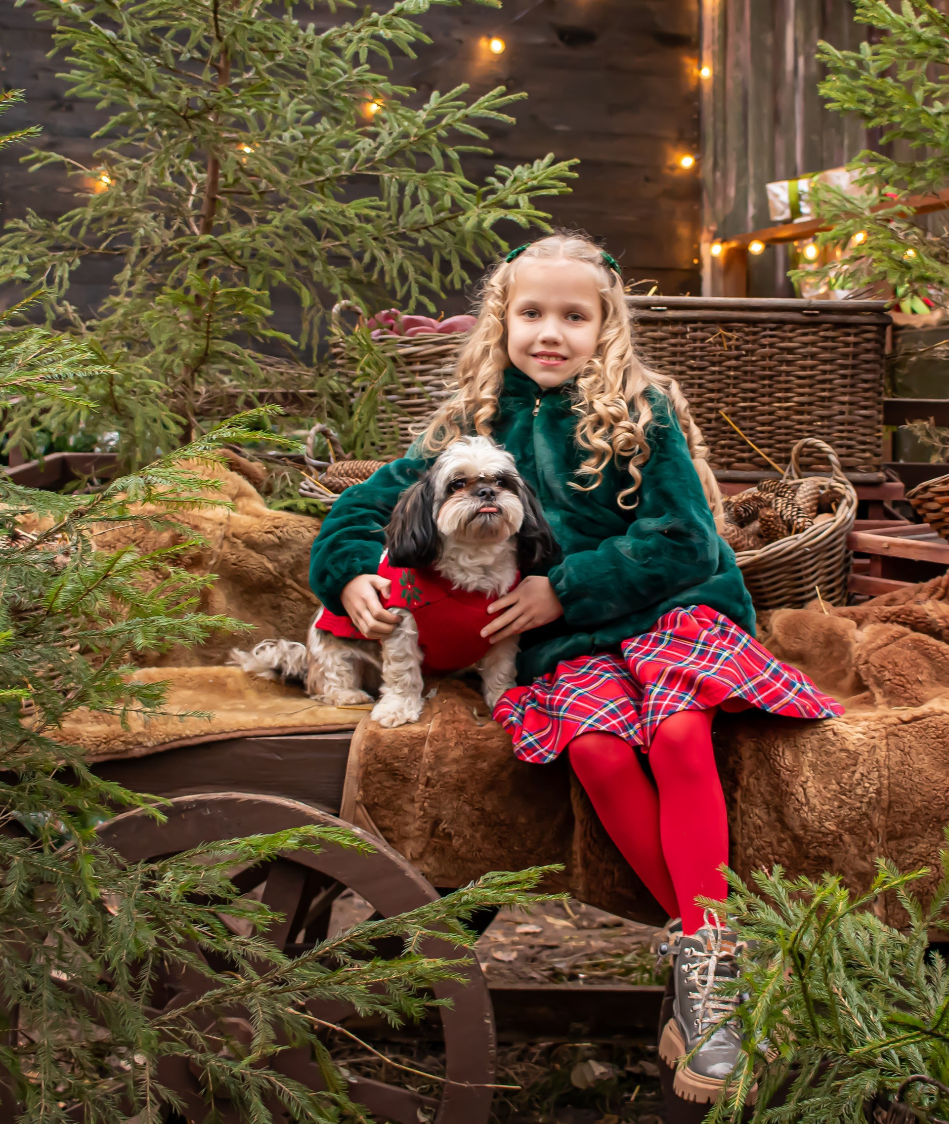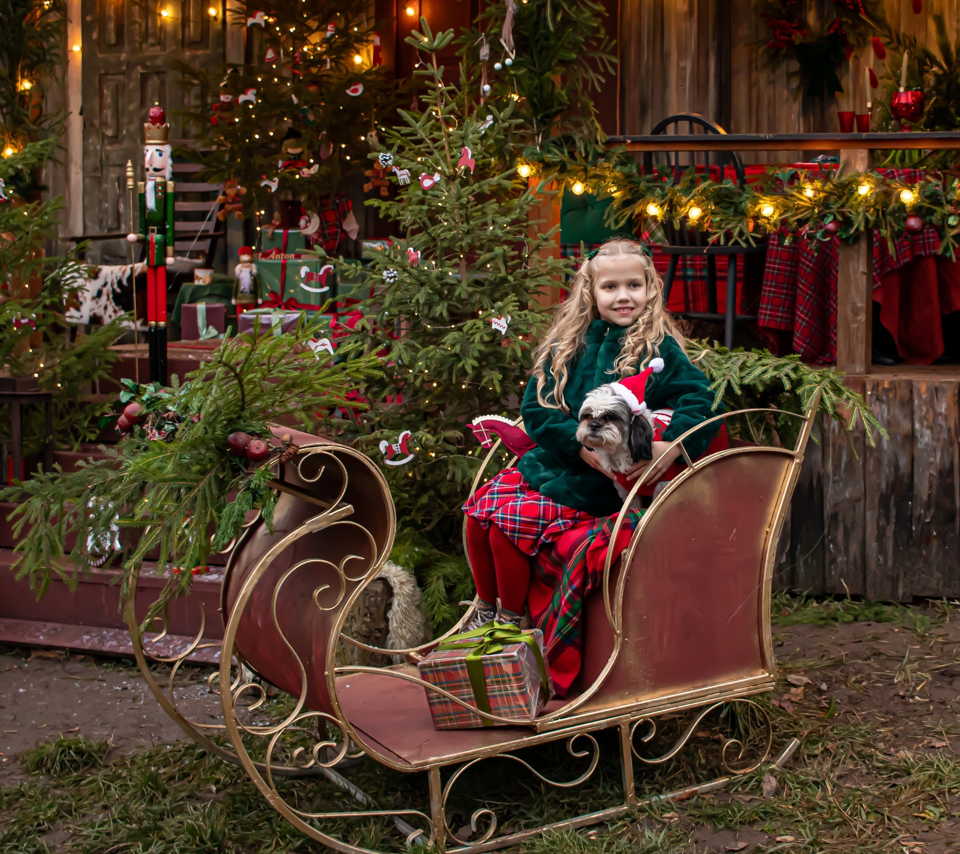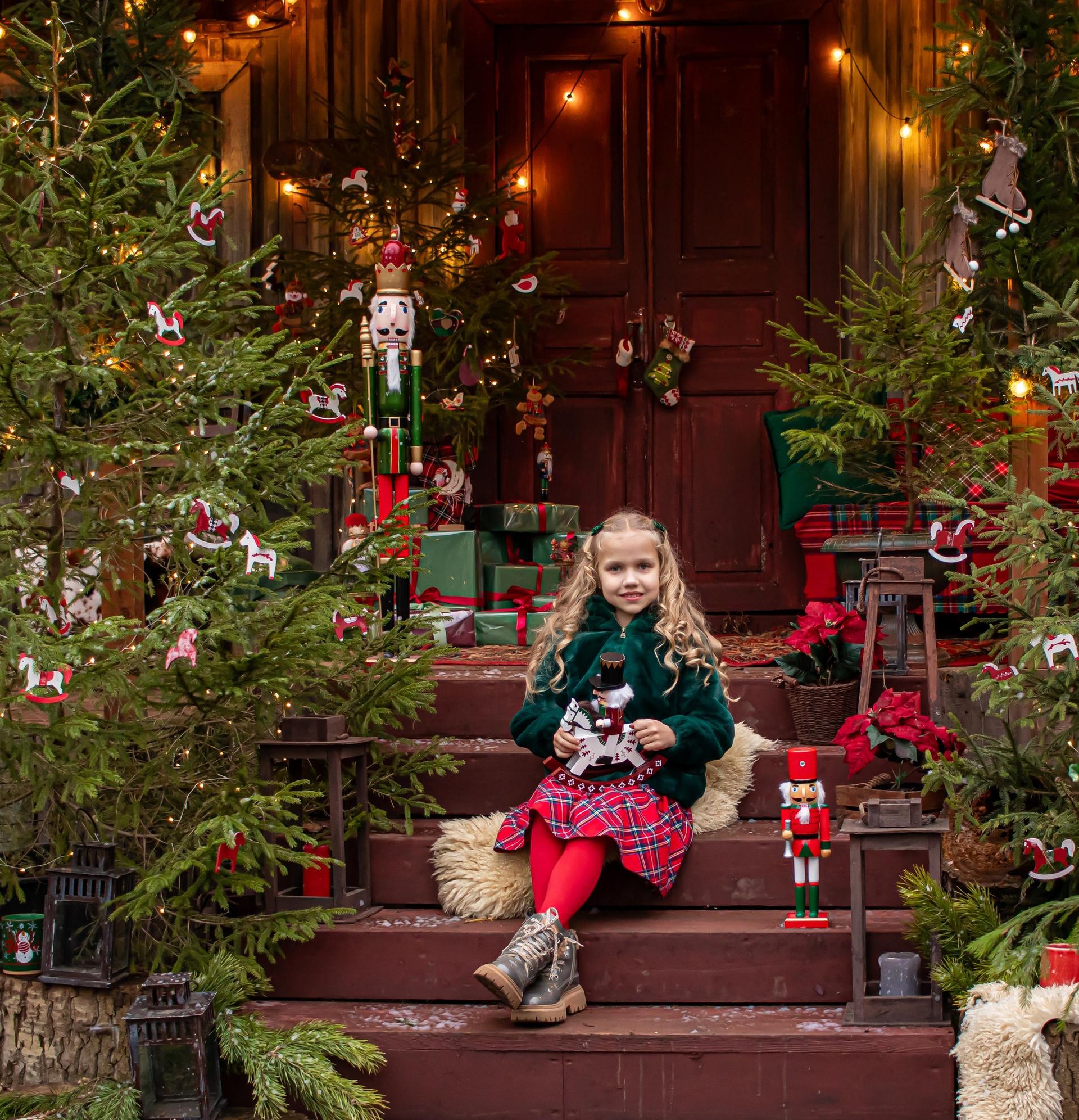 Эта новогодняя съёмка получилась особенно тёплой и атмосферной. Маленькая девочка в праздничном образе — зелёная шубка, пышные кудри, красная клетчатая юбка и яркие акценты — идеально вписалась в рождественскую локацию. Вокруг — еловые ветки, огоньки, подарки, ретро-сани, декоративные корзины и уютное освещение, создающее ощущение настоящей зимней сказки.