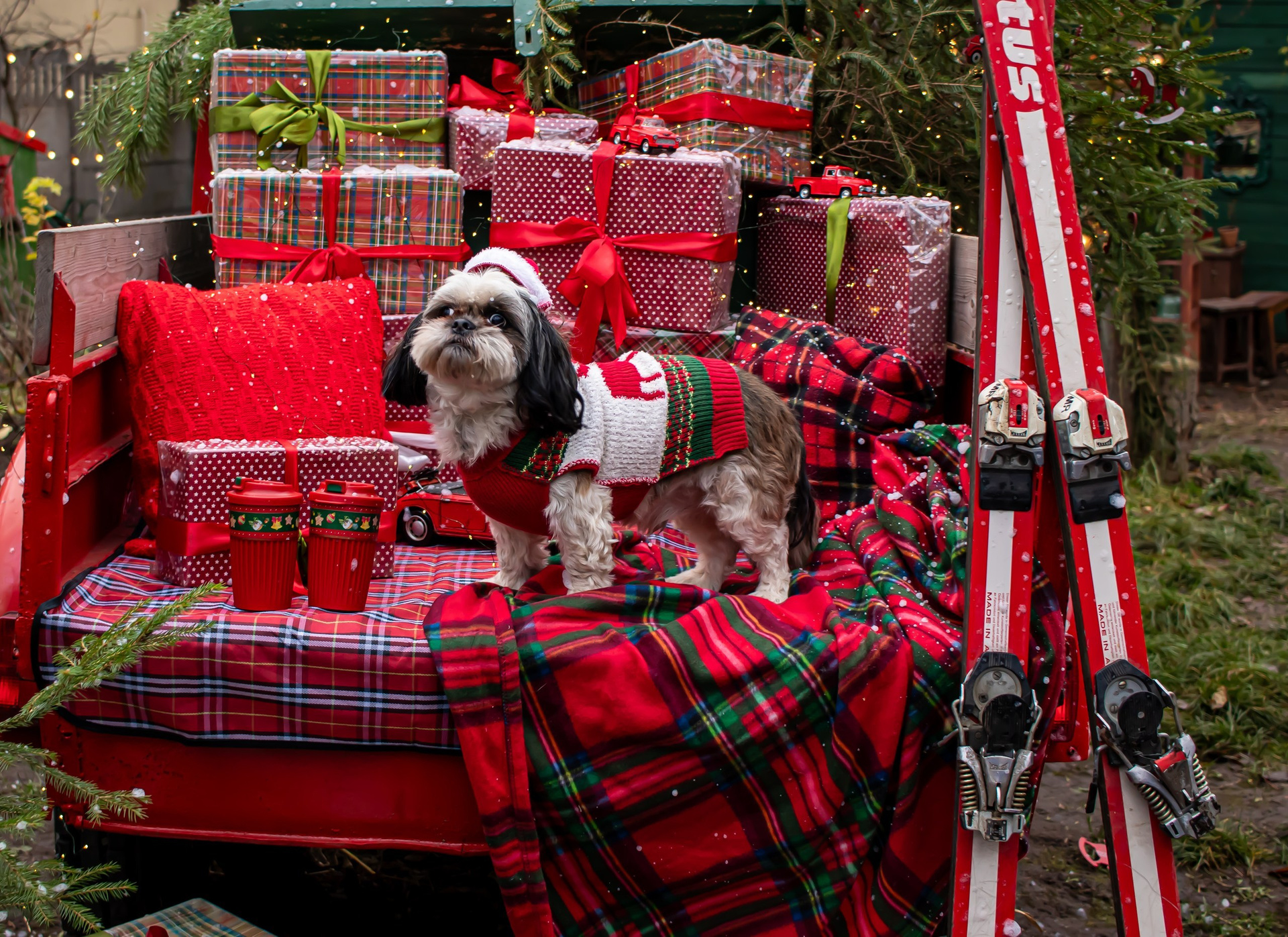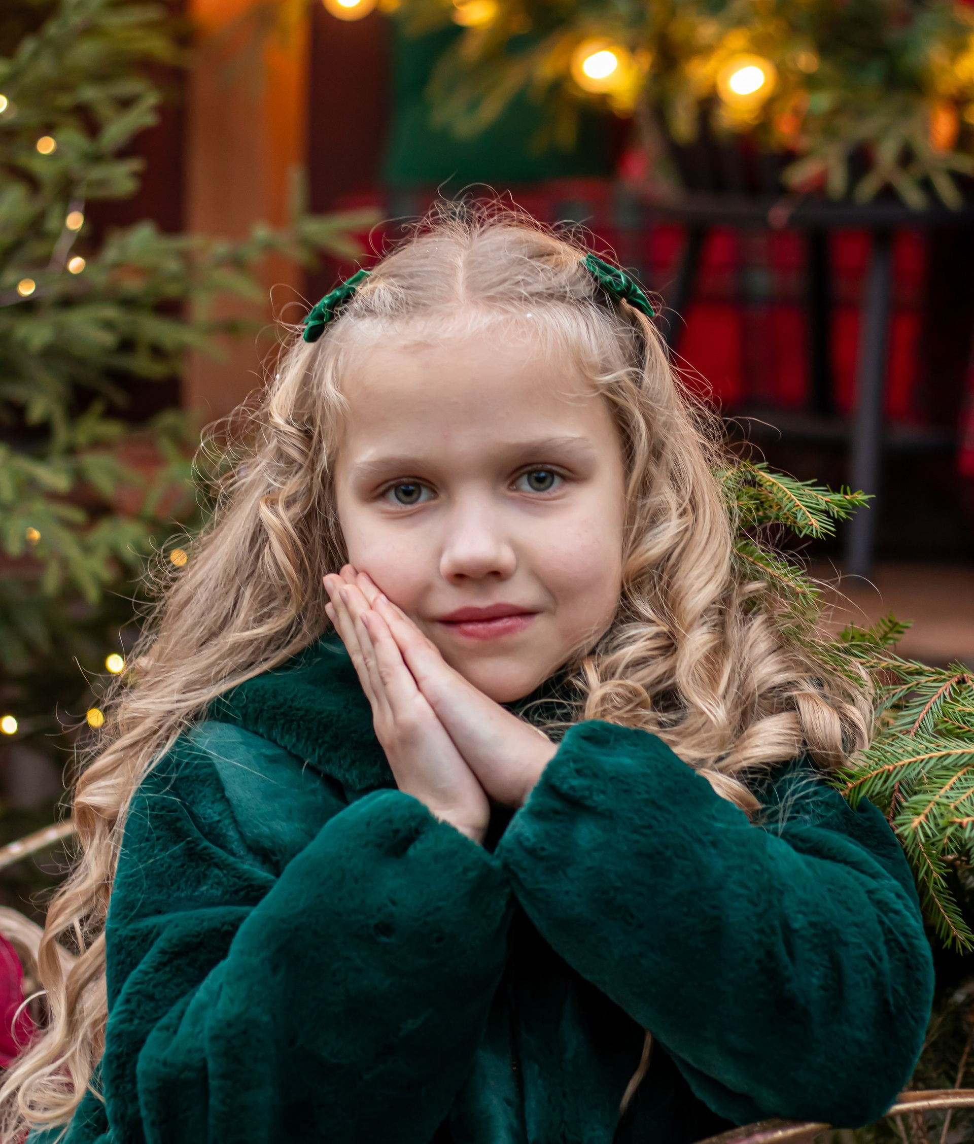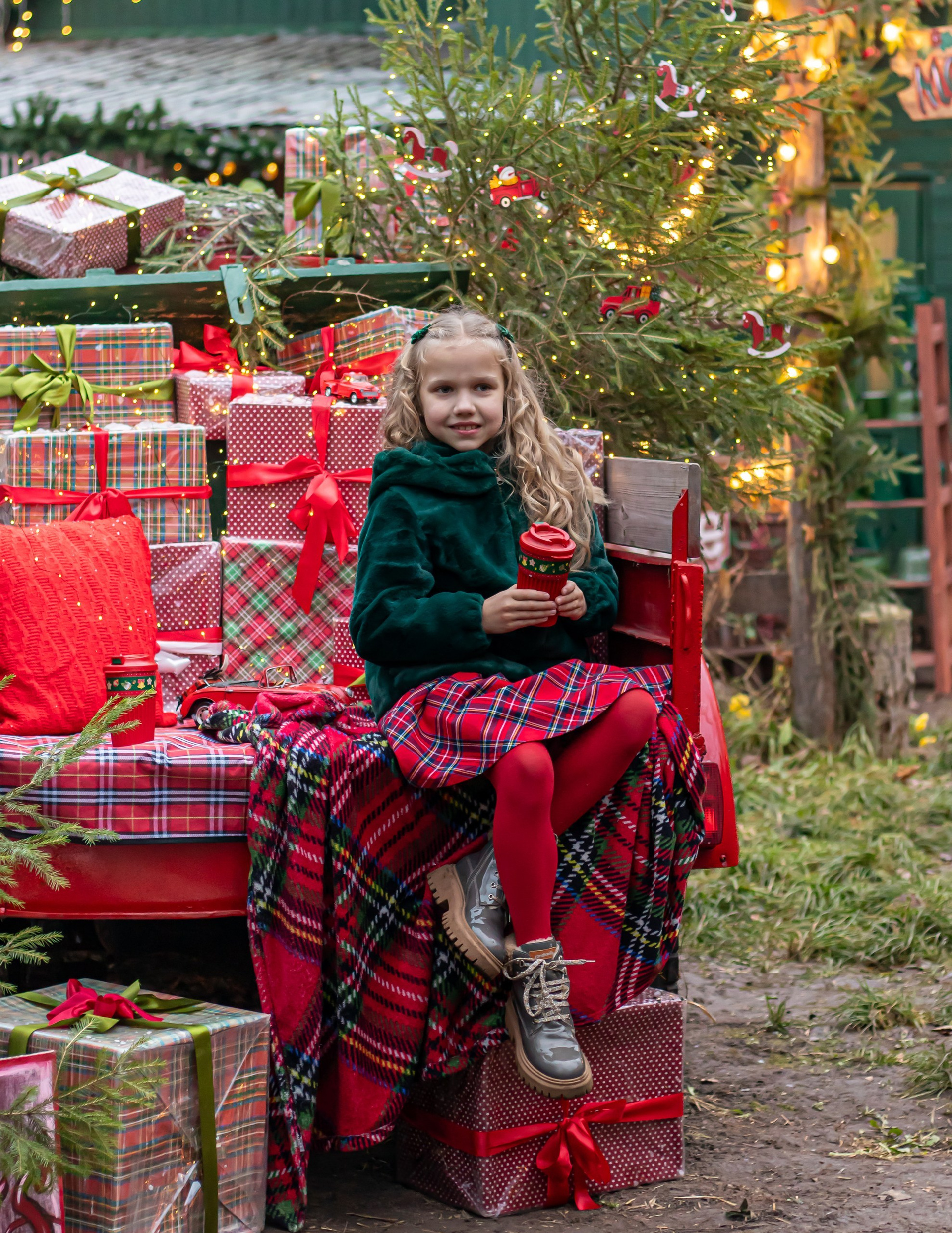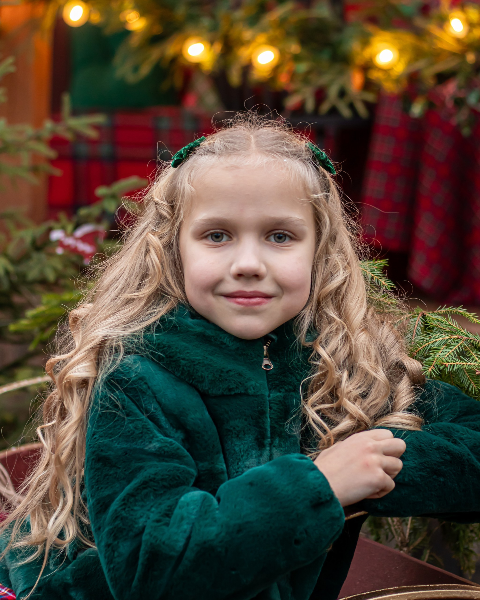 Эта новогодняя съёмка получилась особенно тёплой и атмосферной. Маленькая девочка в праздничном образе — зелёная шубка, пышные кудри, красная клетчатая юбка и яркие акценты — идеально вписалась в рождественскую локацию. Вокруг — еловые ветки, огоньки, подарки, ретро-сани, декоративные корзины и уютное освещение, создающее ощущение настоящей зимней сказки.