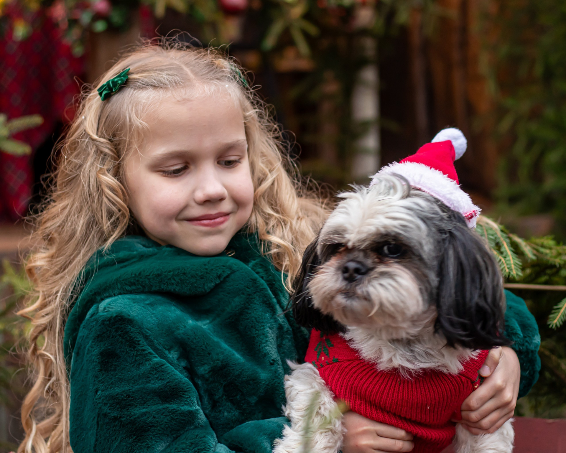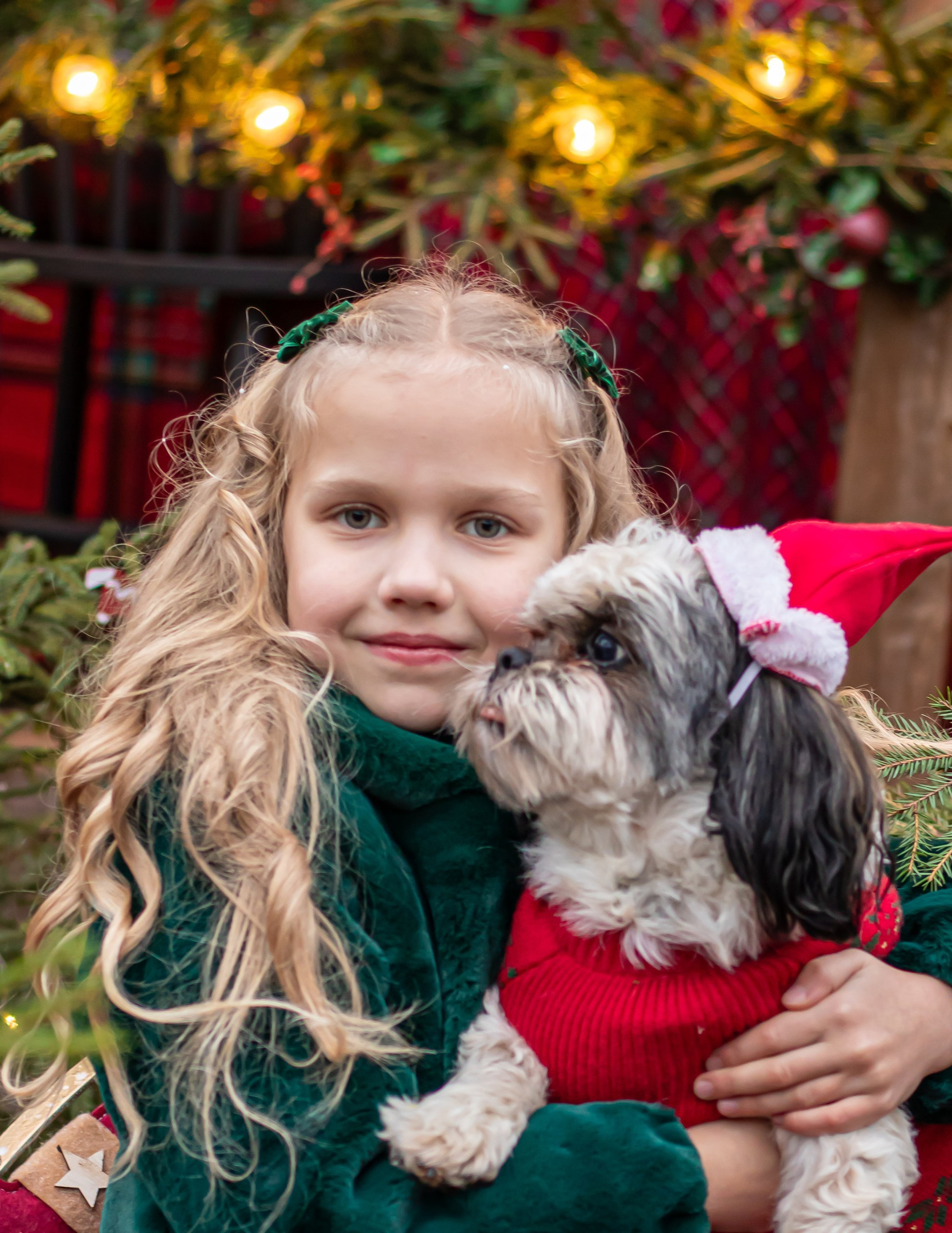 В серии много живых моментов: девочка играет с собачкой, рассматривает игрушки и подарки, сидит в санях, держит праздничный термостакан, улыбается и просто наслаждается атмосферой. Благодаря естественному поведению ребёнка кадры получаются искренними, нежными и эмоциональными. Именно такие фото становятся частичкой семейной истории и идеально подходят для новогодних открыток, календарей или подарков родственникам.