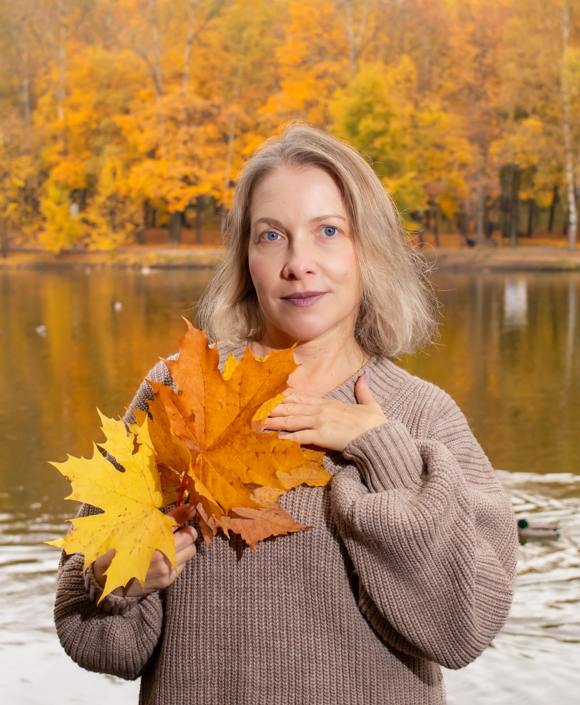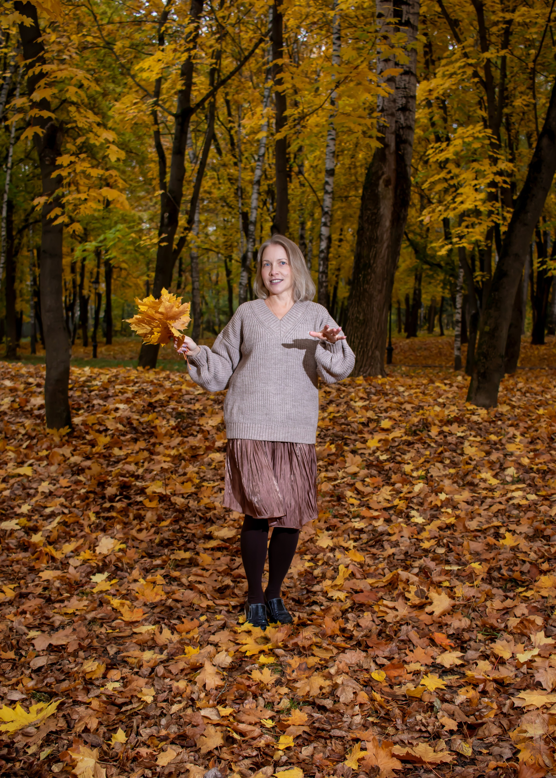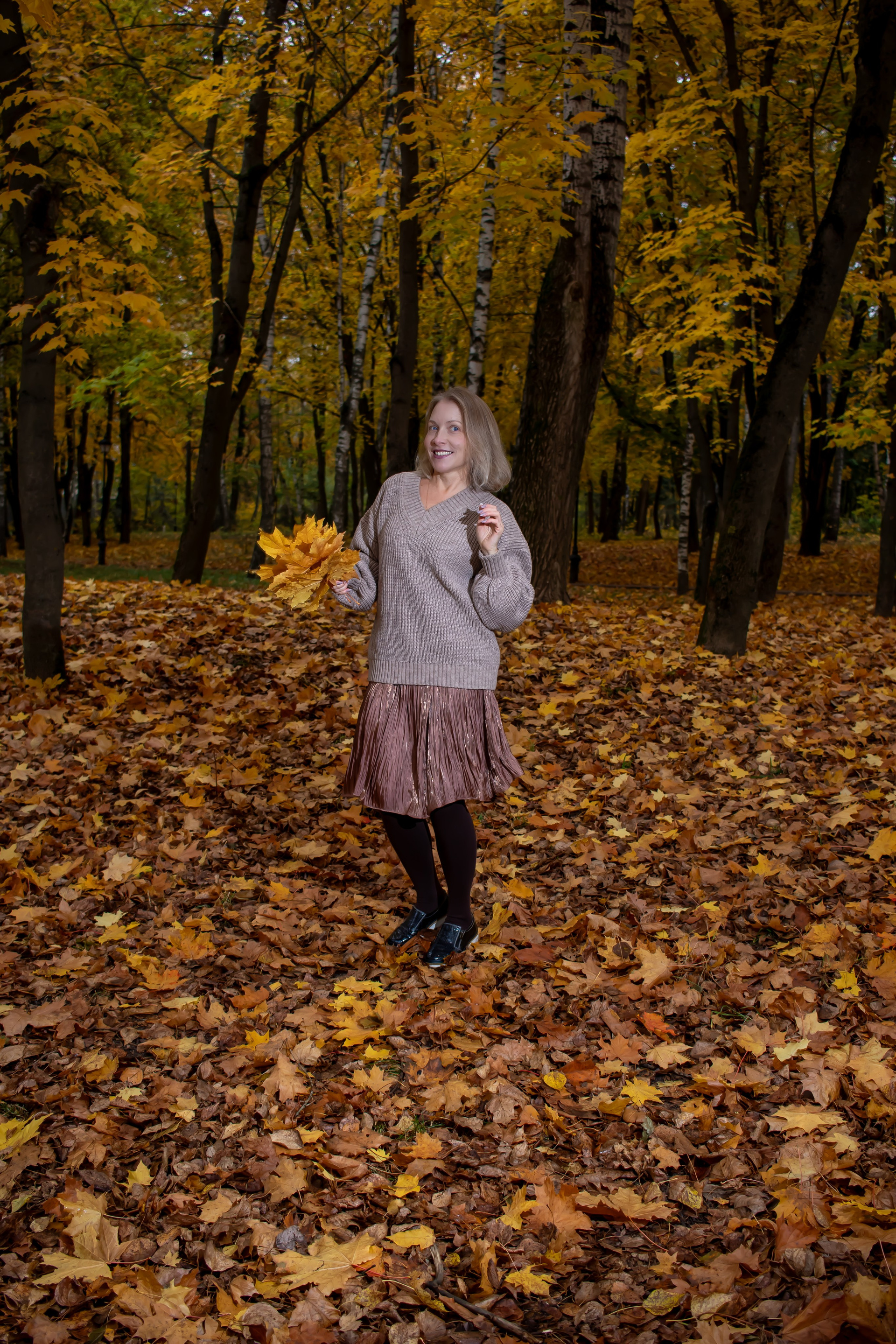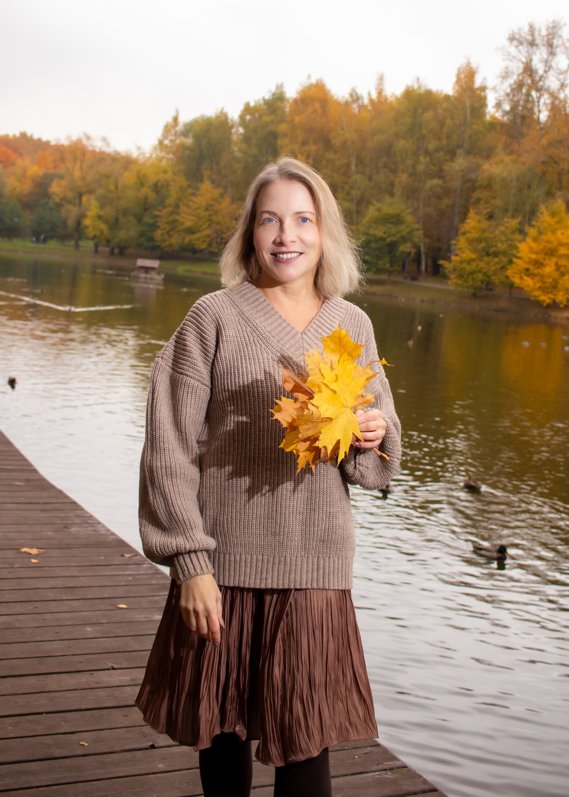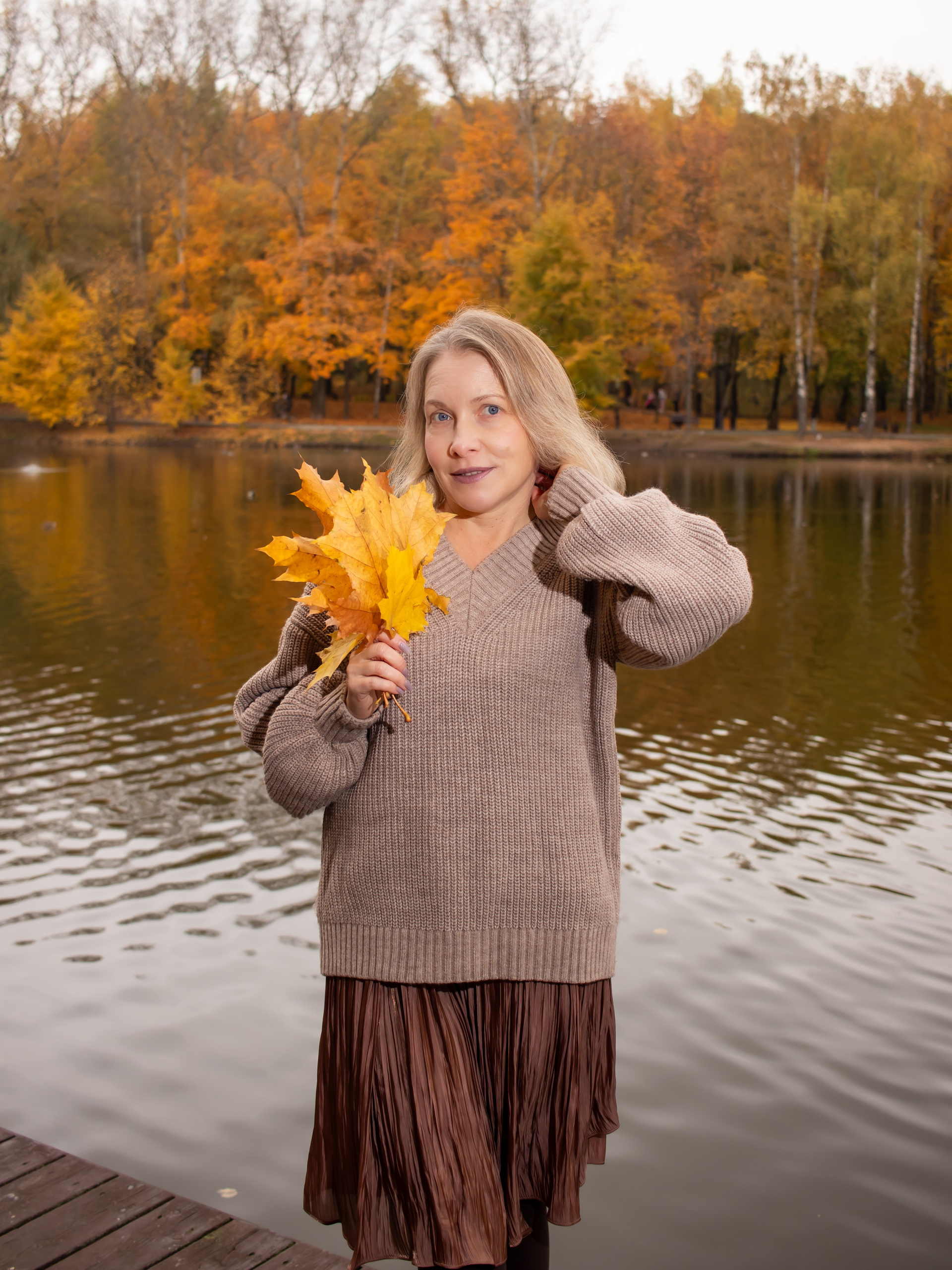 Тёплые оттенки, золотые листья и уют осени. Наталья в мягком свитере и лёгком настроении — пример, как осень раскрывает естественную красоту.
