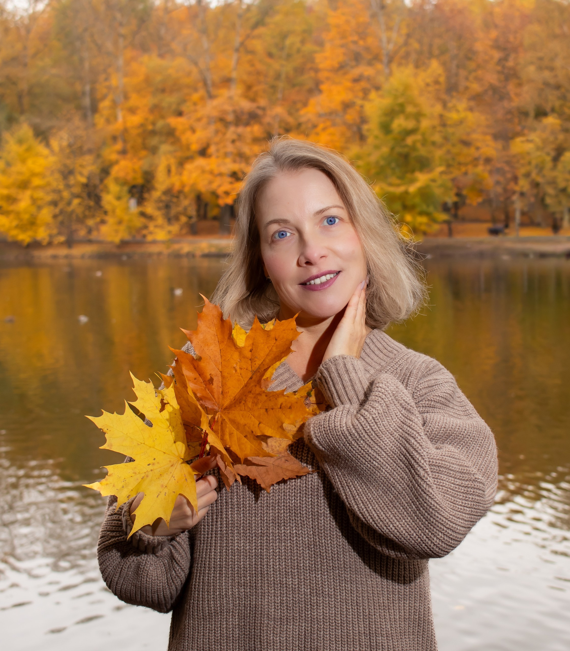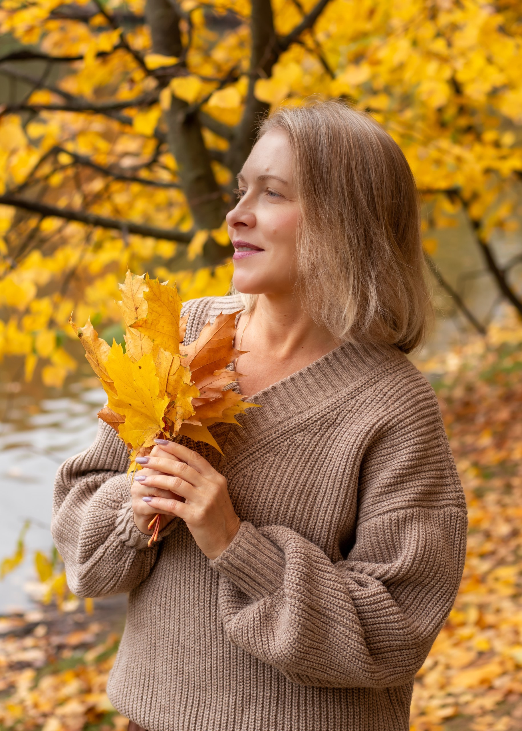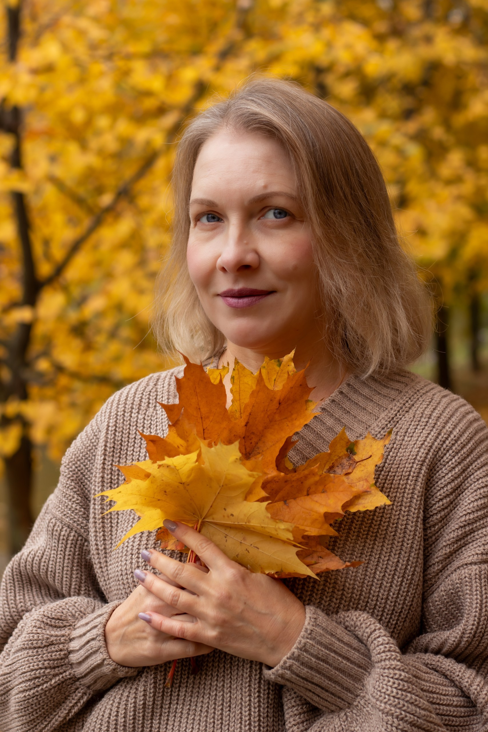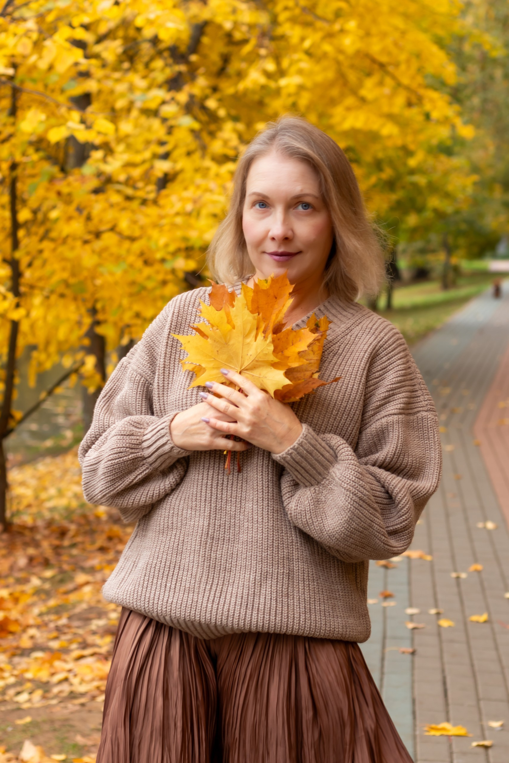 Тёплые оттенки, золотые листья и уют осени. Наталья в мягком свитере и лёгком настроении — пример, как осень раскрывает естественную красоту.