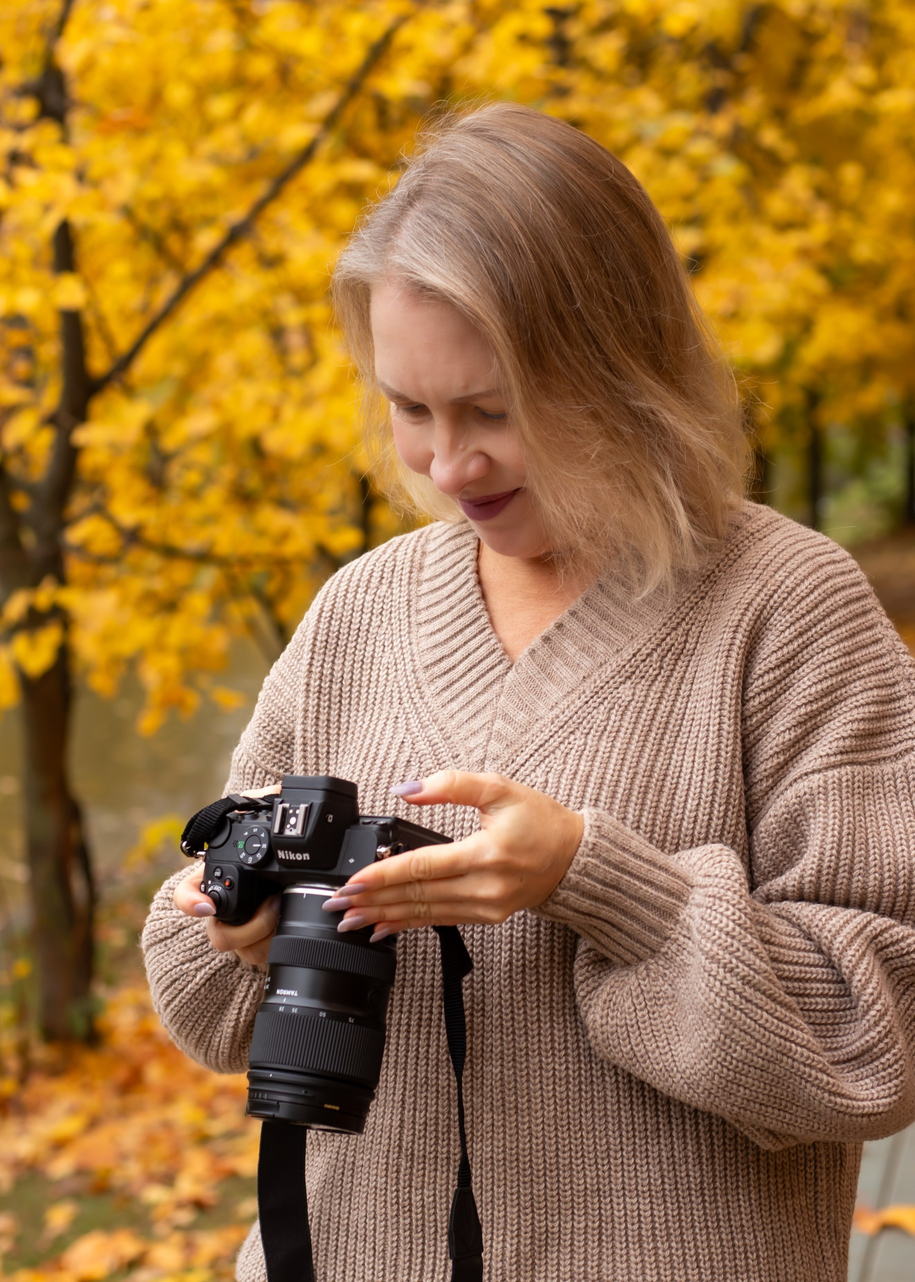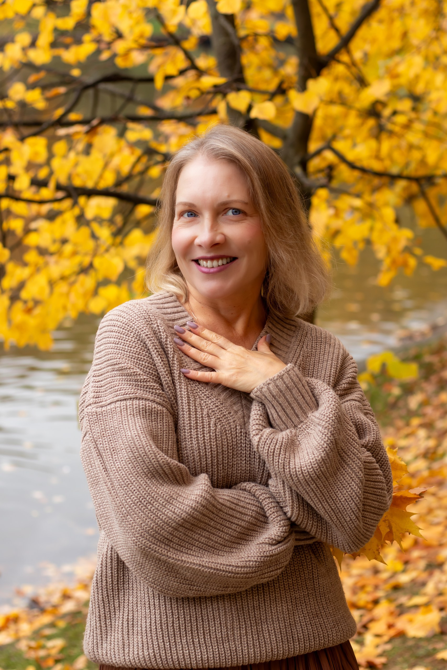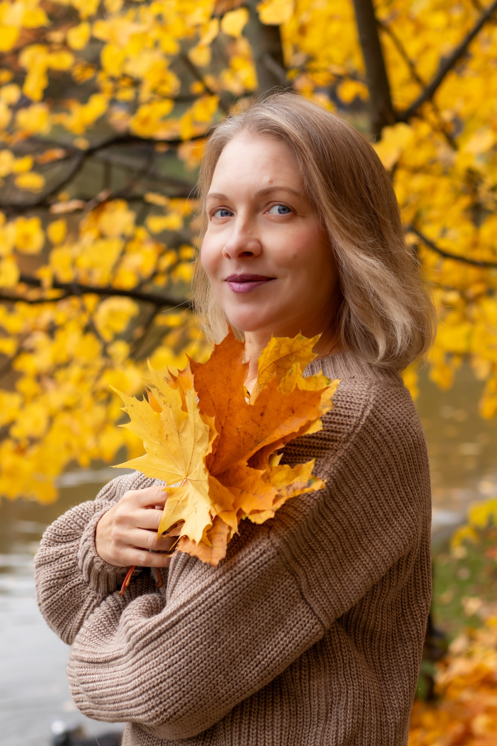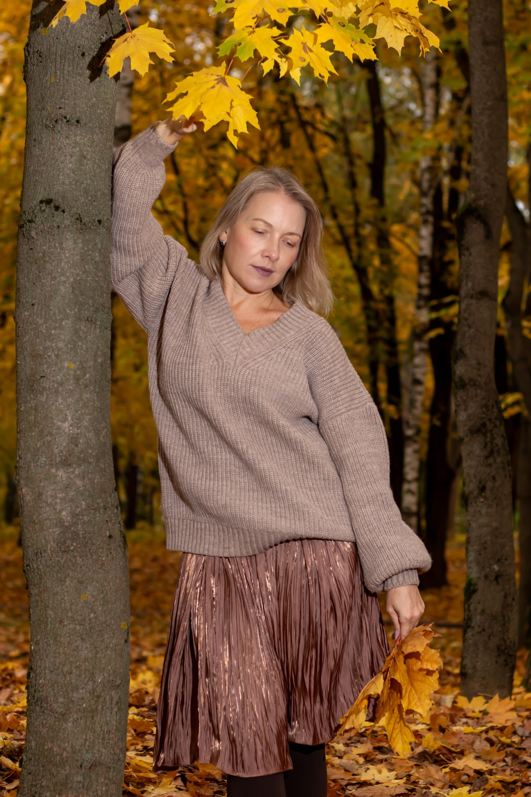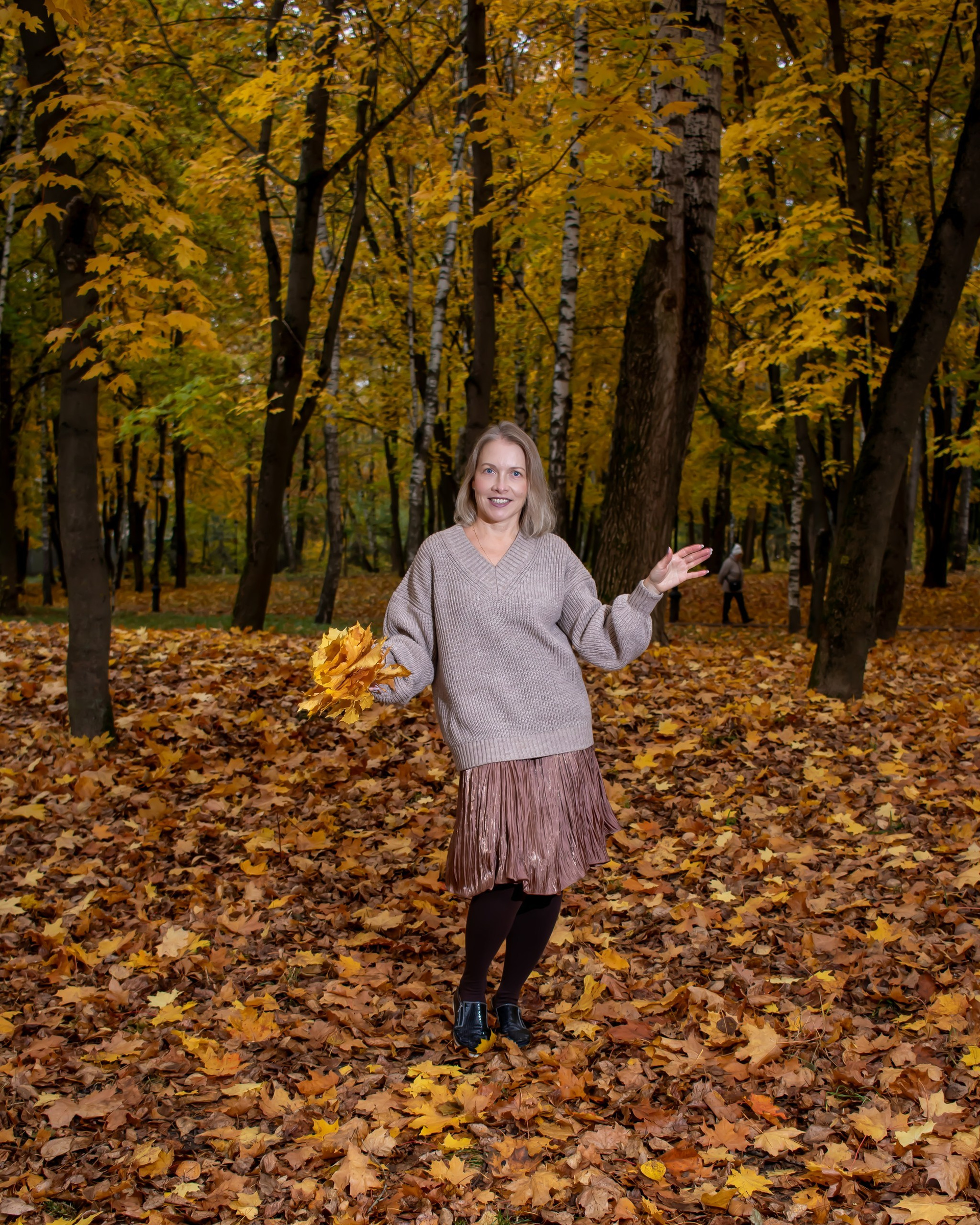 Тёплые оттенки, золотые листья и уют осени. Наталья в мягком свитере и лёгком настроении — пример, как осень раскрывает естественную красоту.