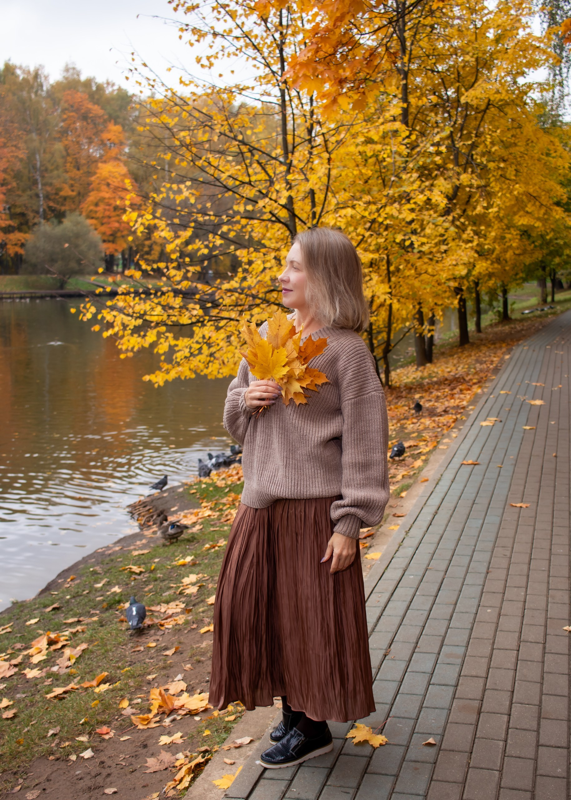 Образ был собран в природных оттенках: объёмный свитер, длинная юбка, букет кленовых листьев. Простые детали помогли сохранить ощущение лёгкости и естественности, без перегруженности и лишней театральности.
