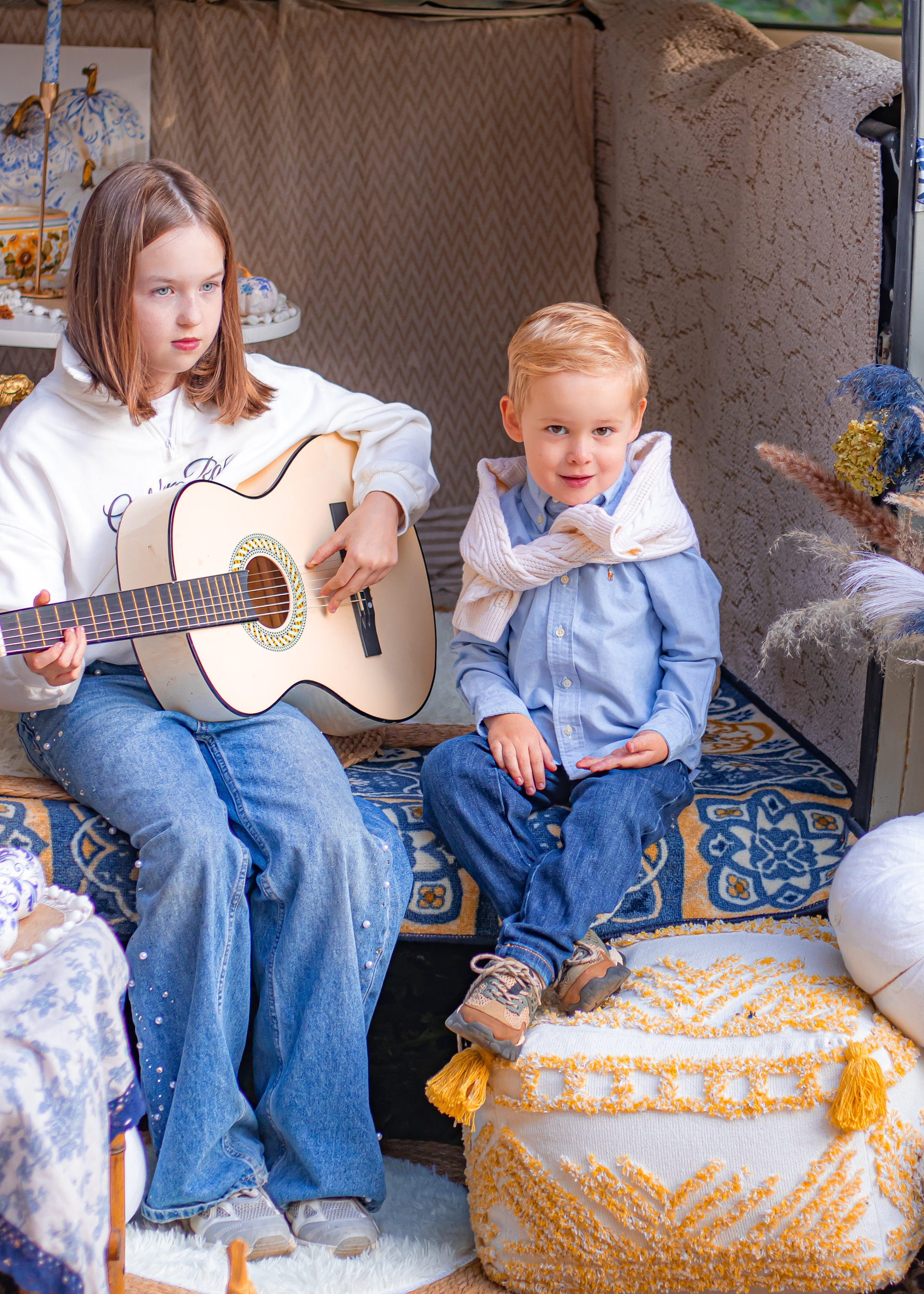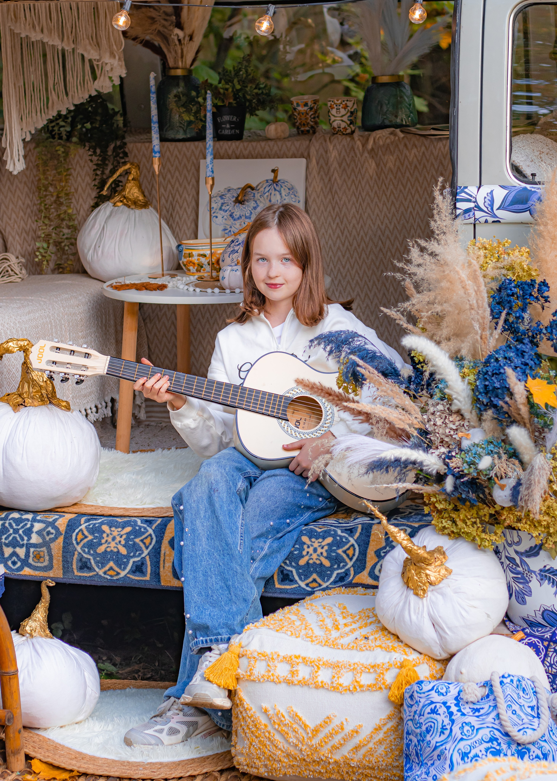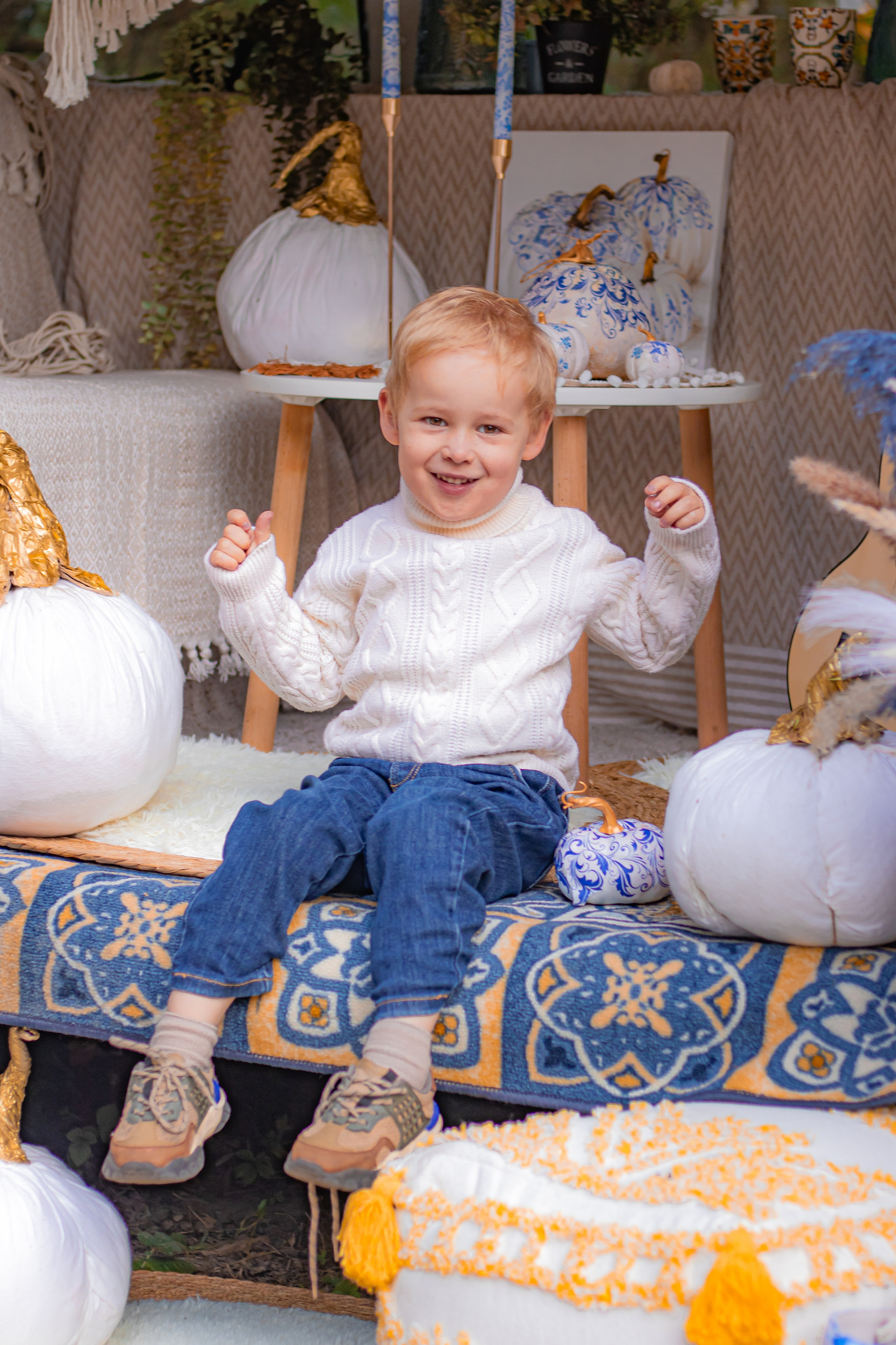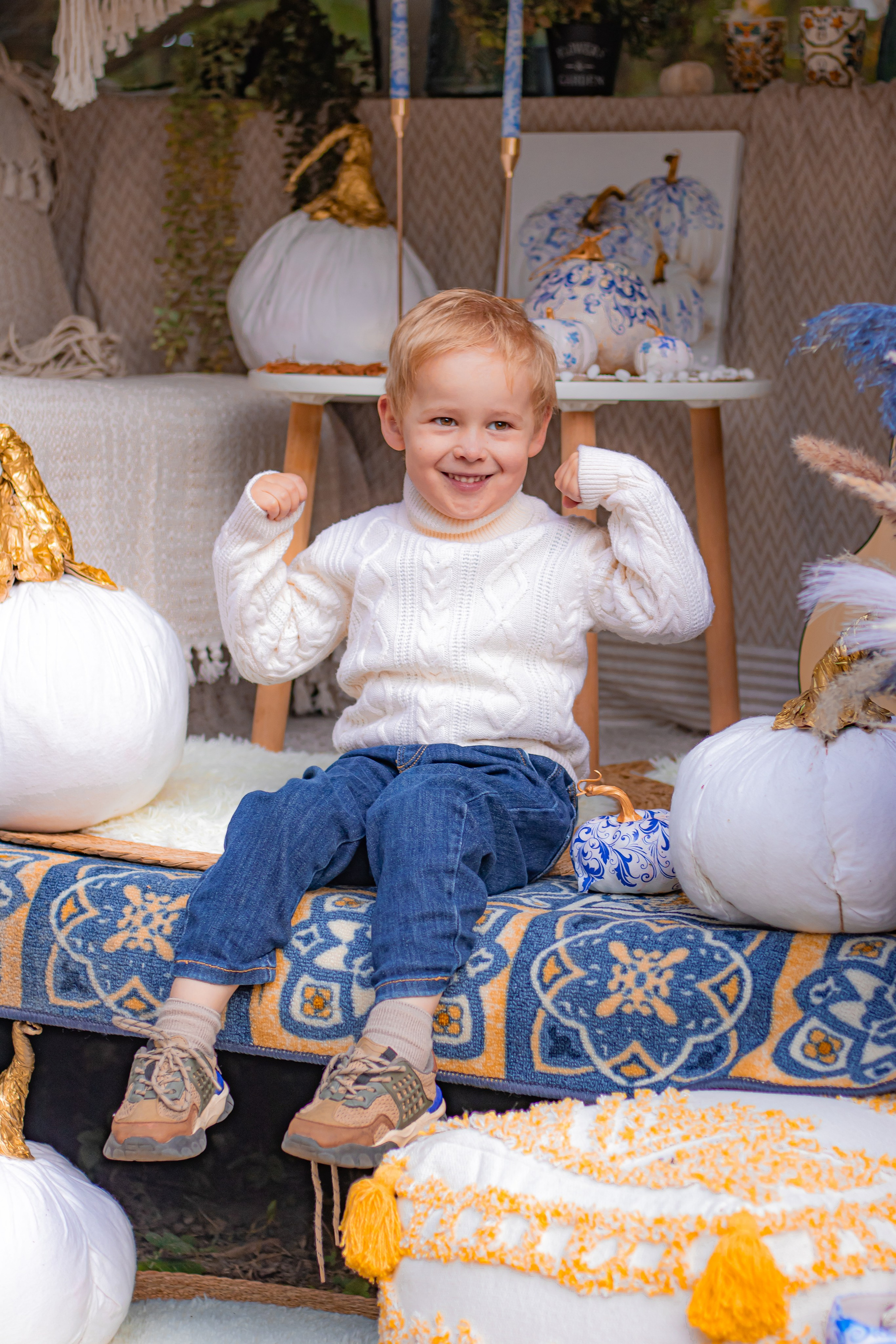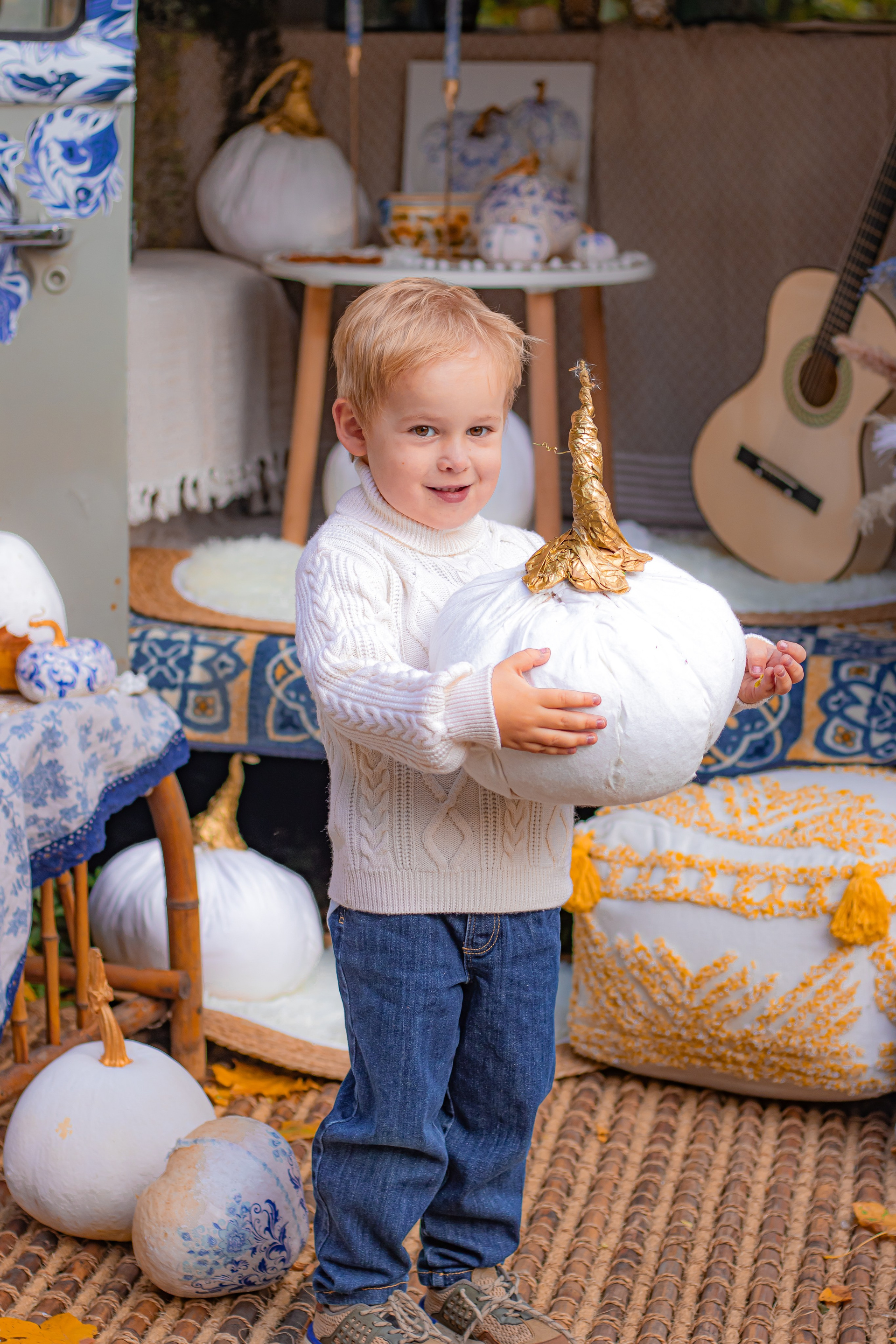 Сухоцветы, белые тыквы, тёплые пледы и мягкий свет создают настроение уюта, а дети добавляют жизни и радости каждому кадру.