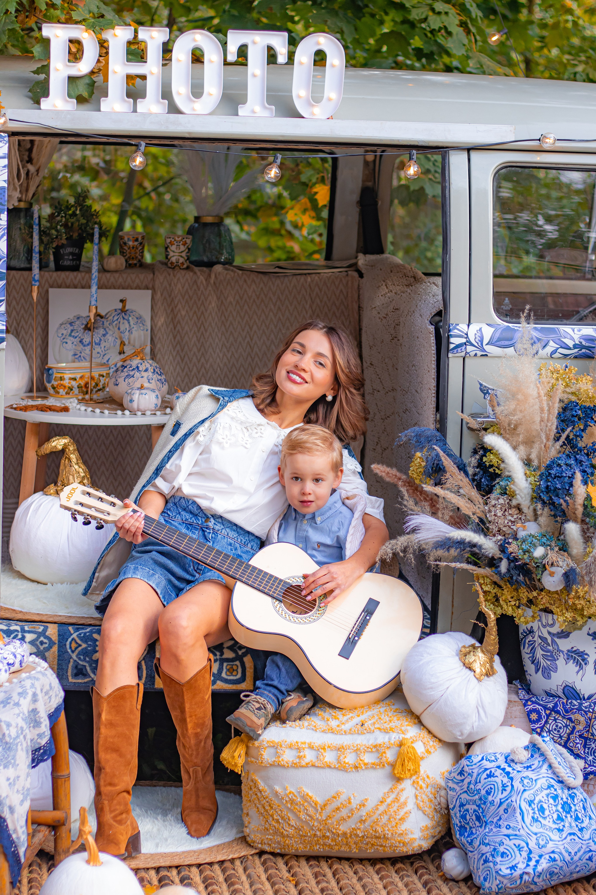 Осенняя семейная съёмка в уютной ретро-локации с белым фургоном и атмосферой уюта.