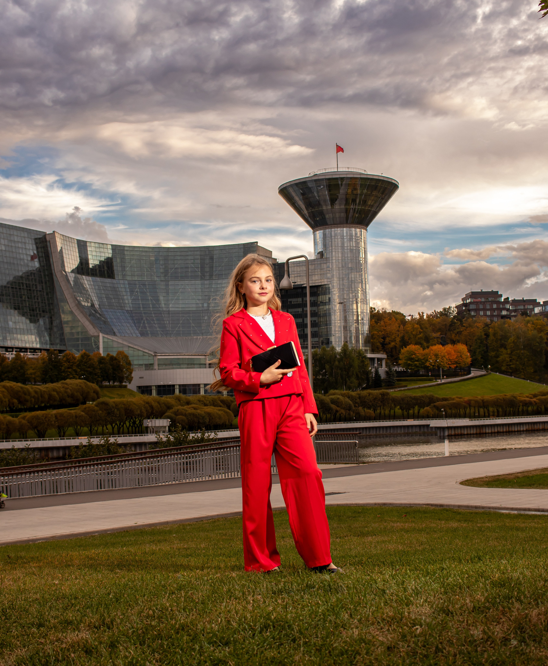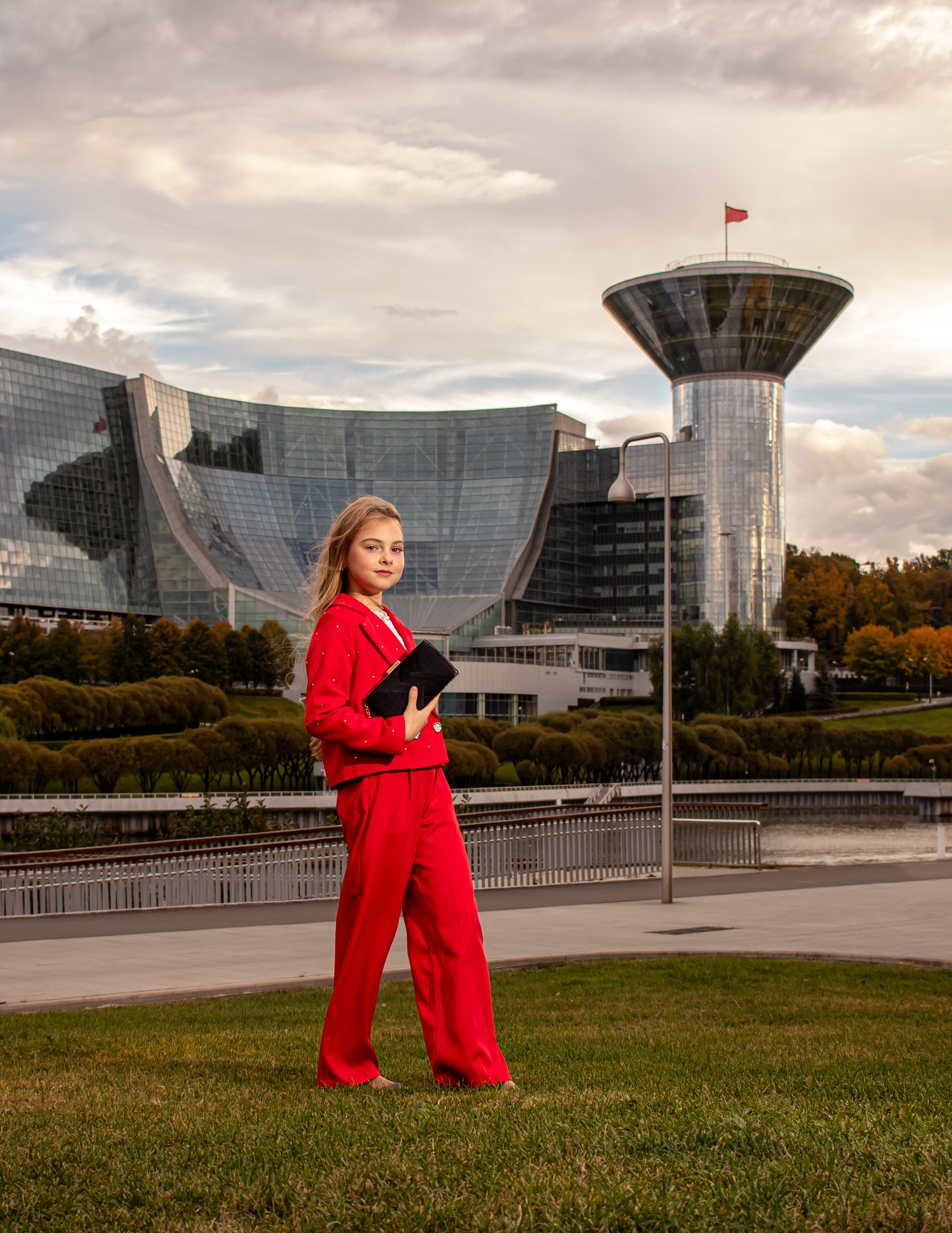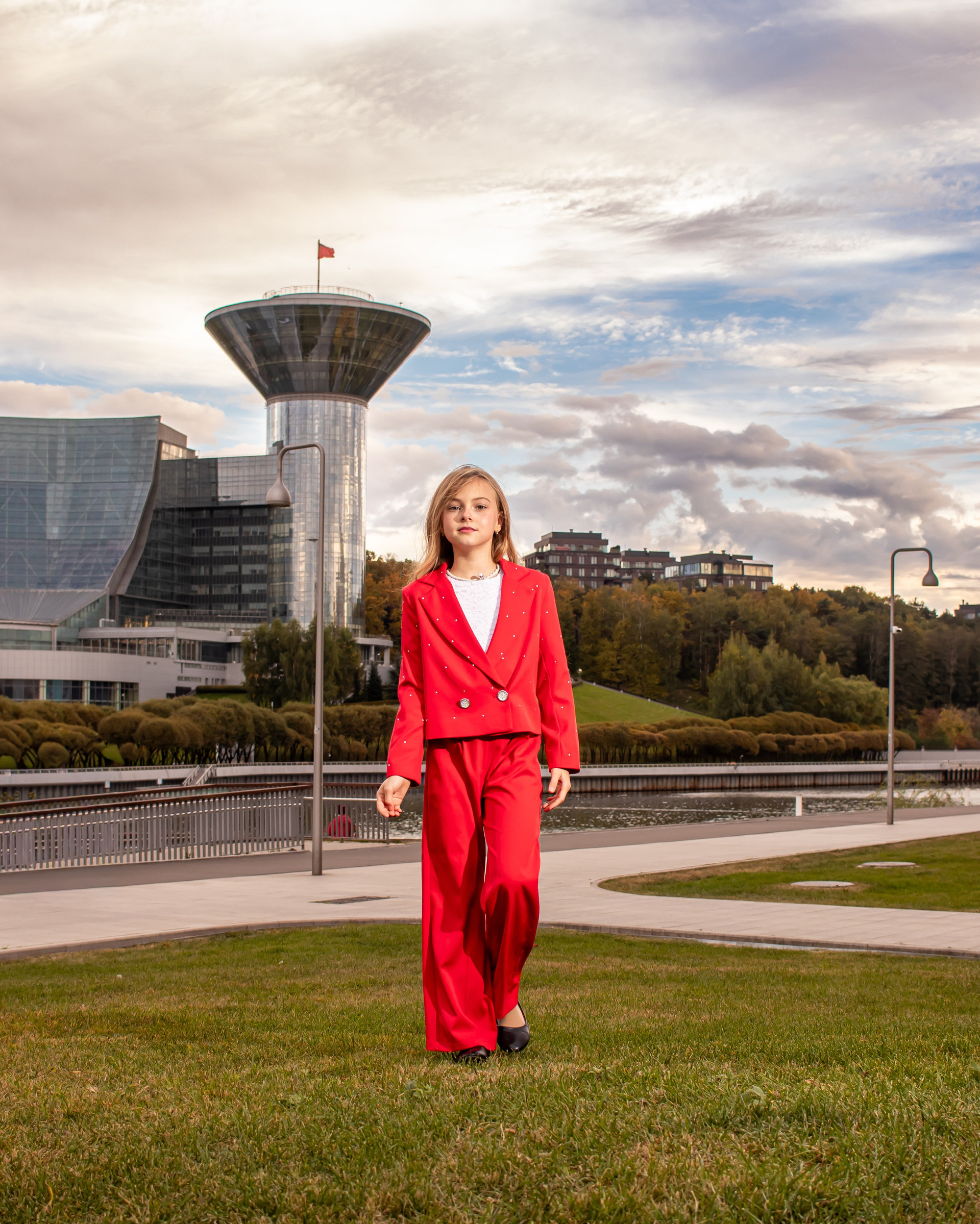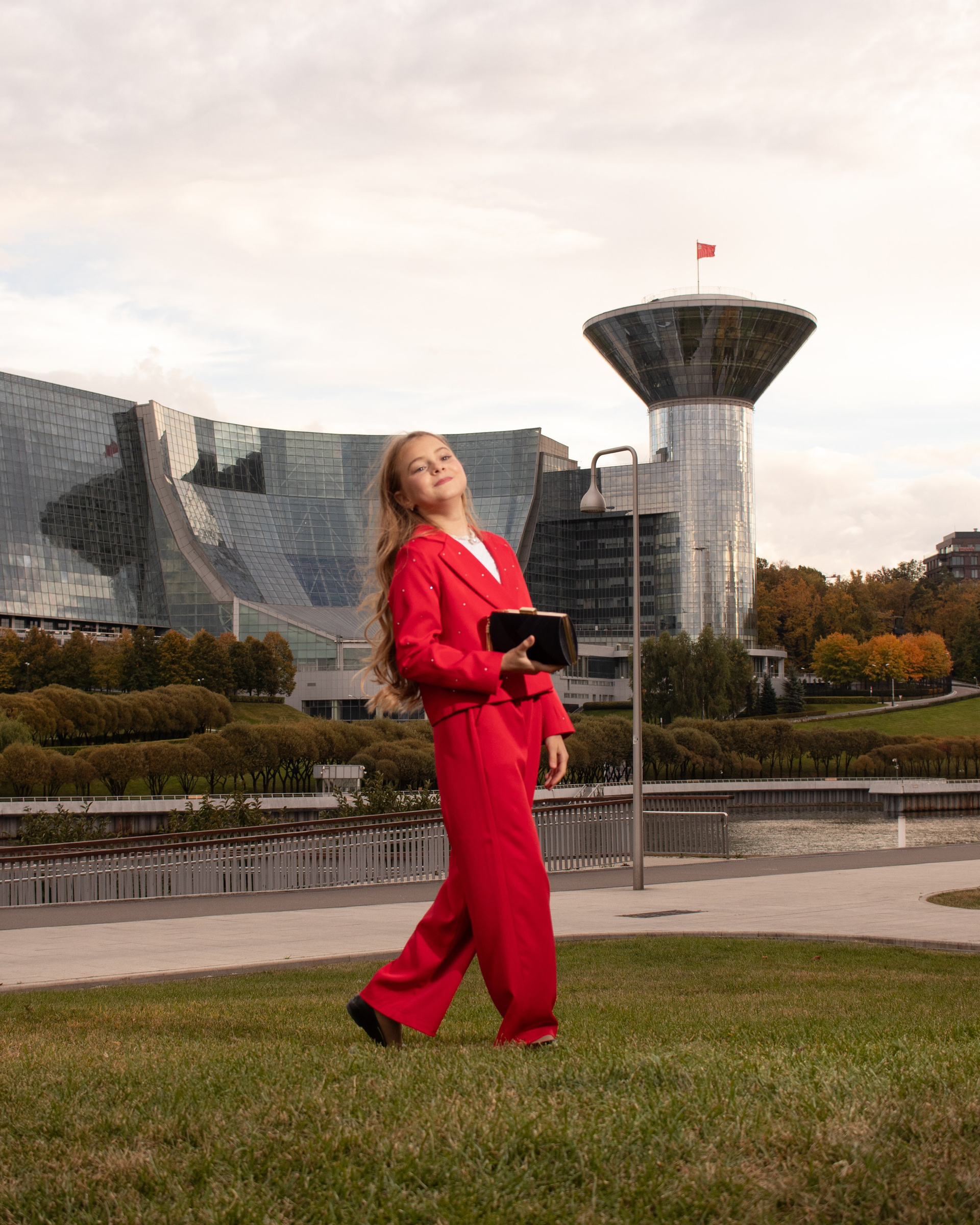 Красный костюм Виктории стал ярким акцентом среди осенних красок и городского света.