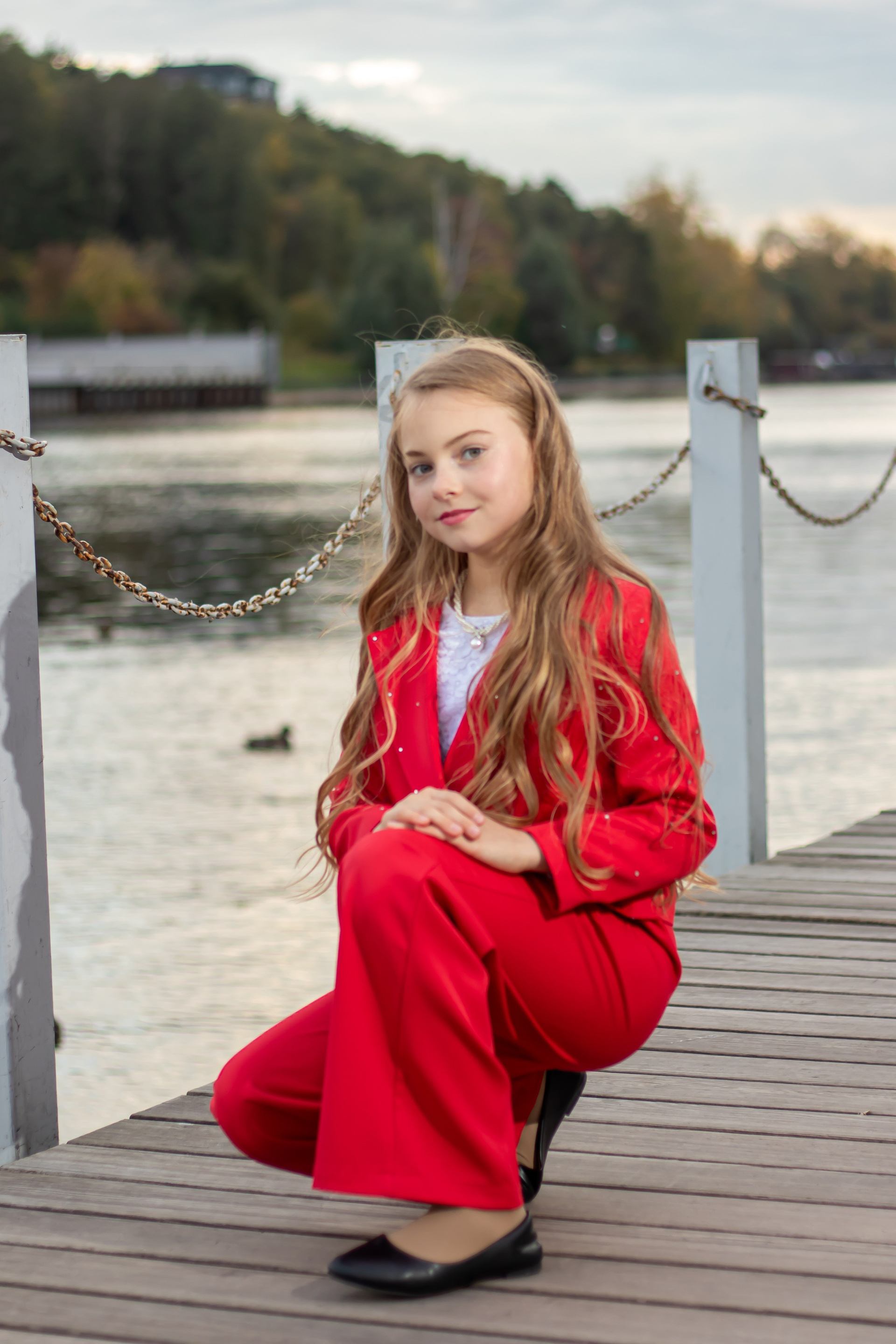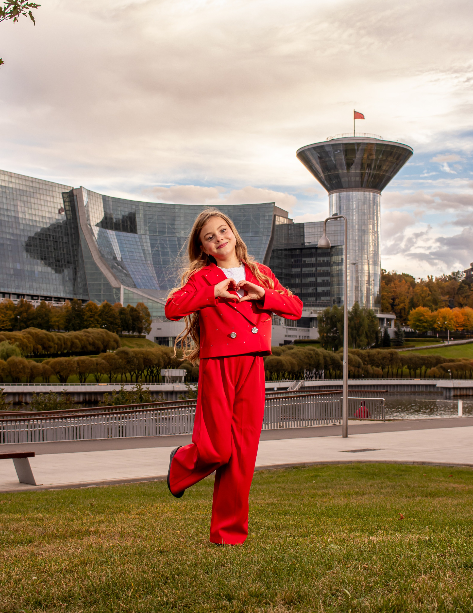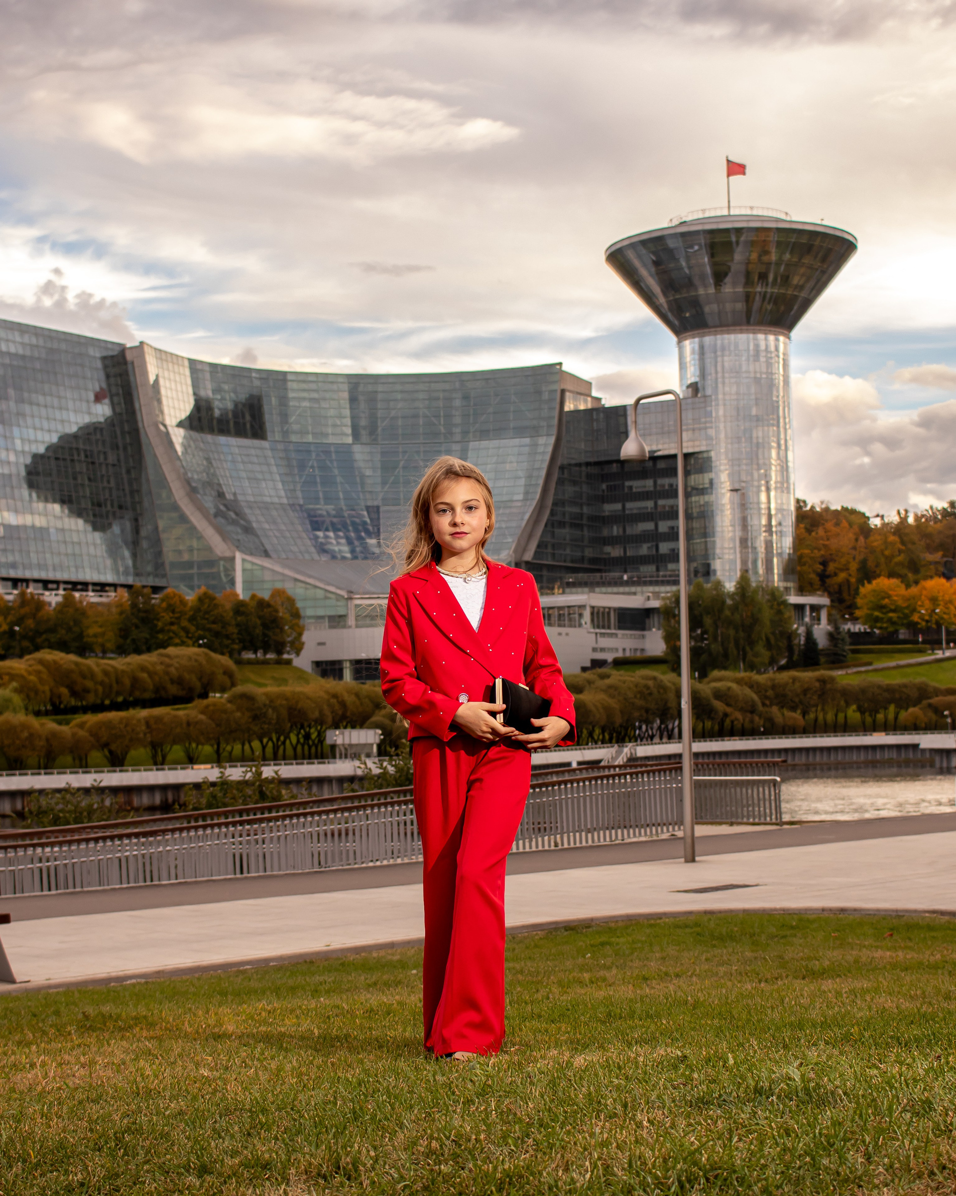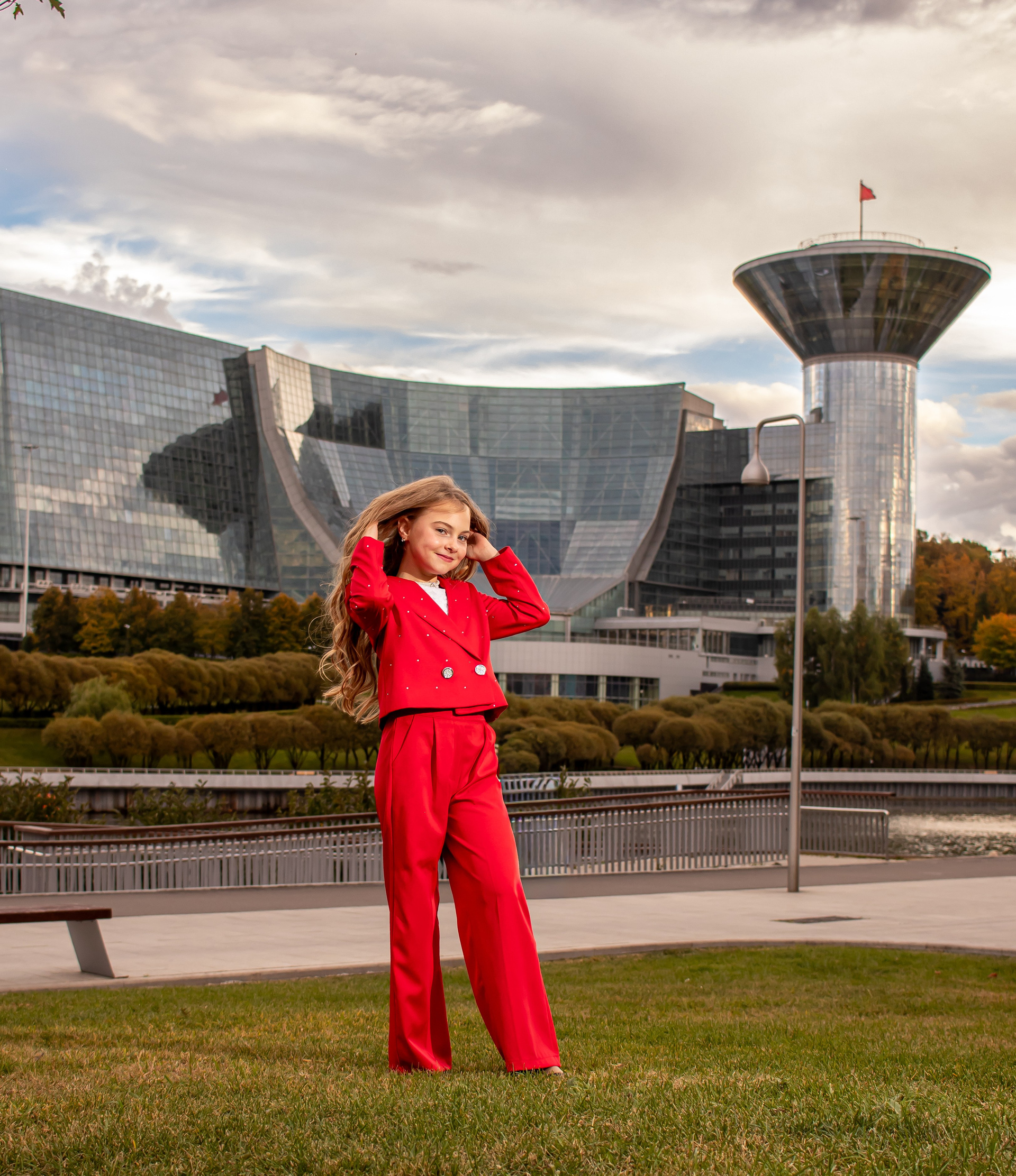 Красный костюм Виктории стал ярким акцентом среди осенних красок и городского света.