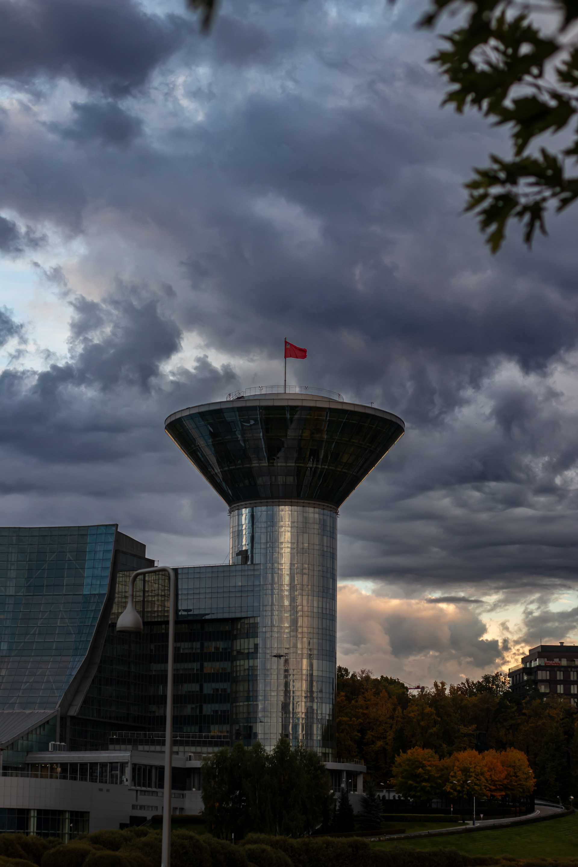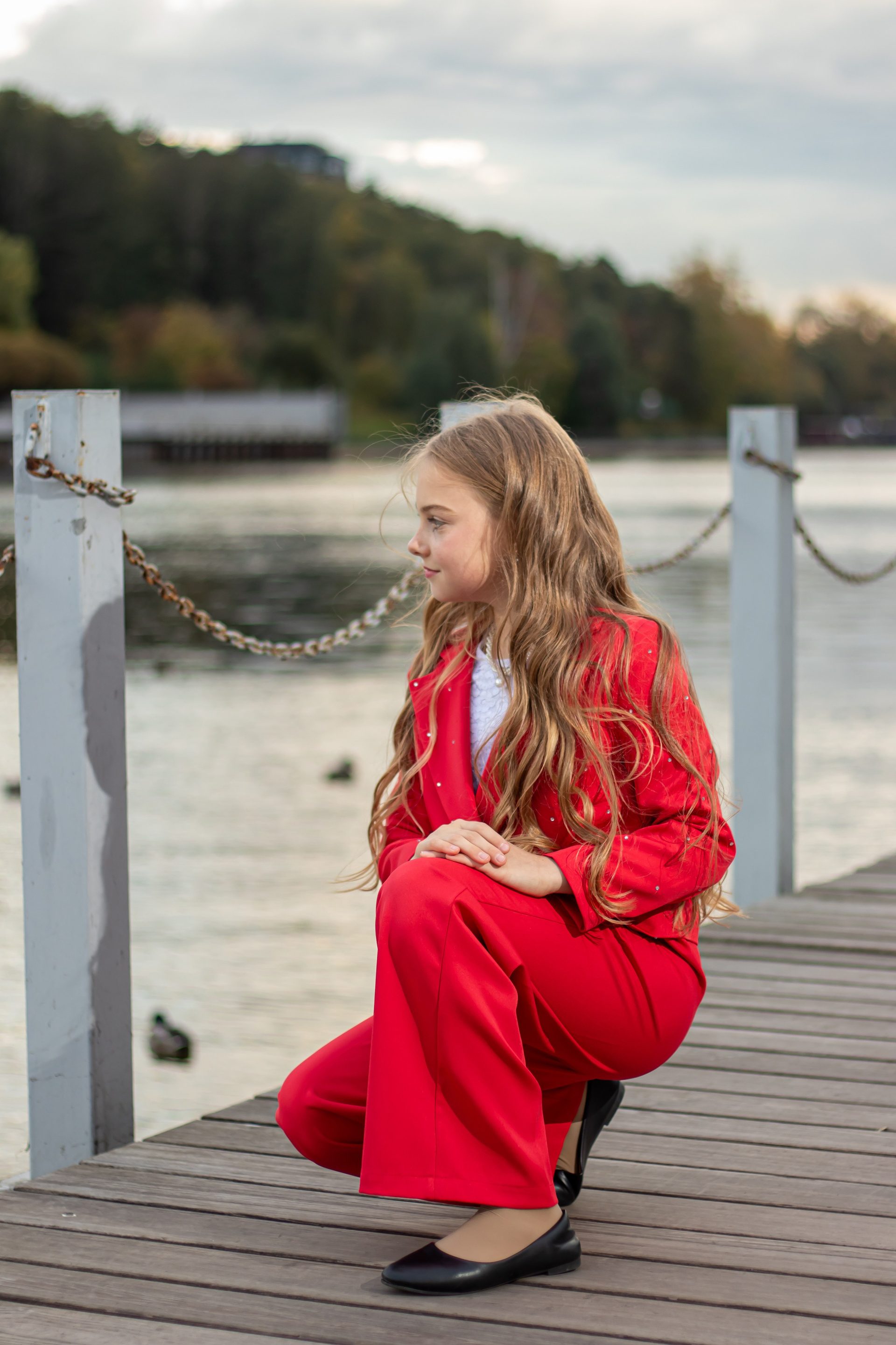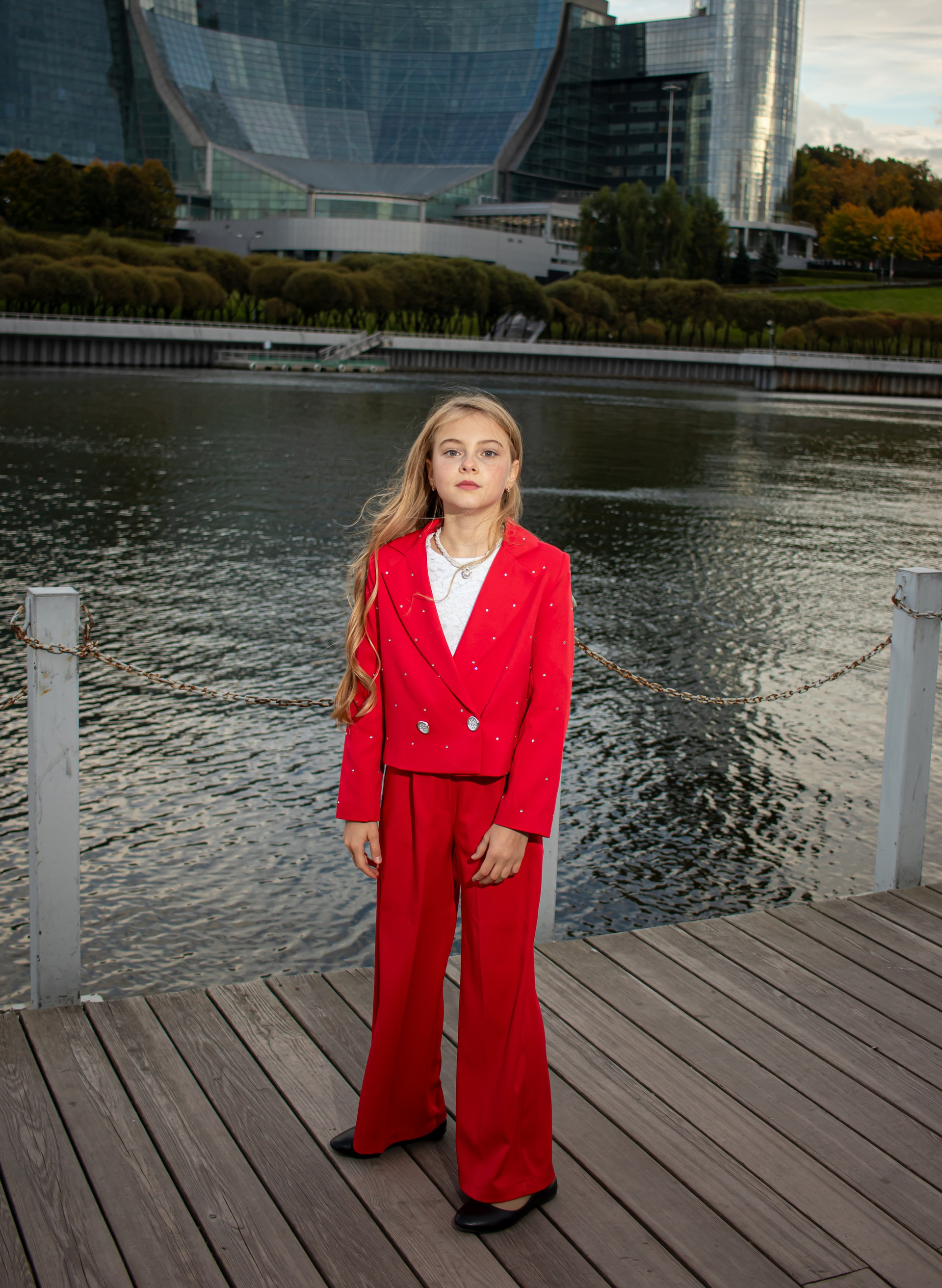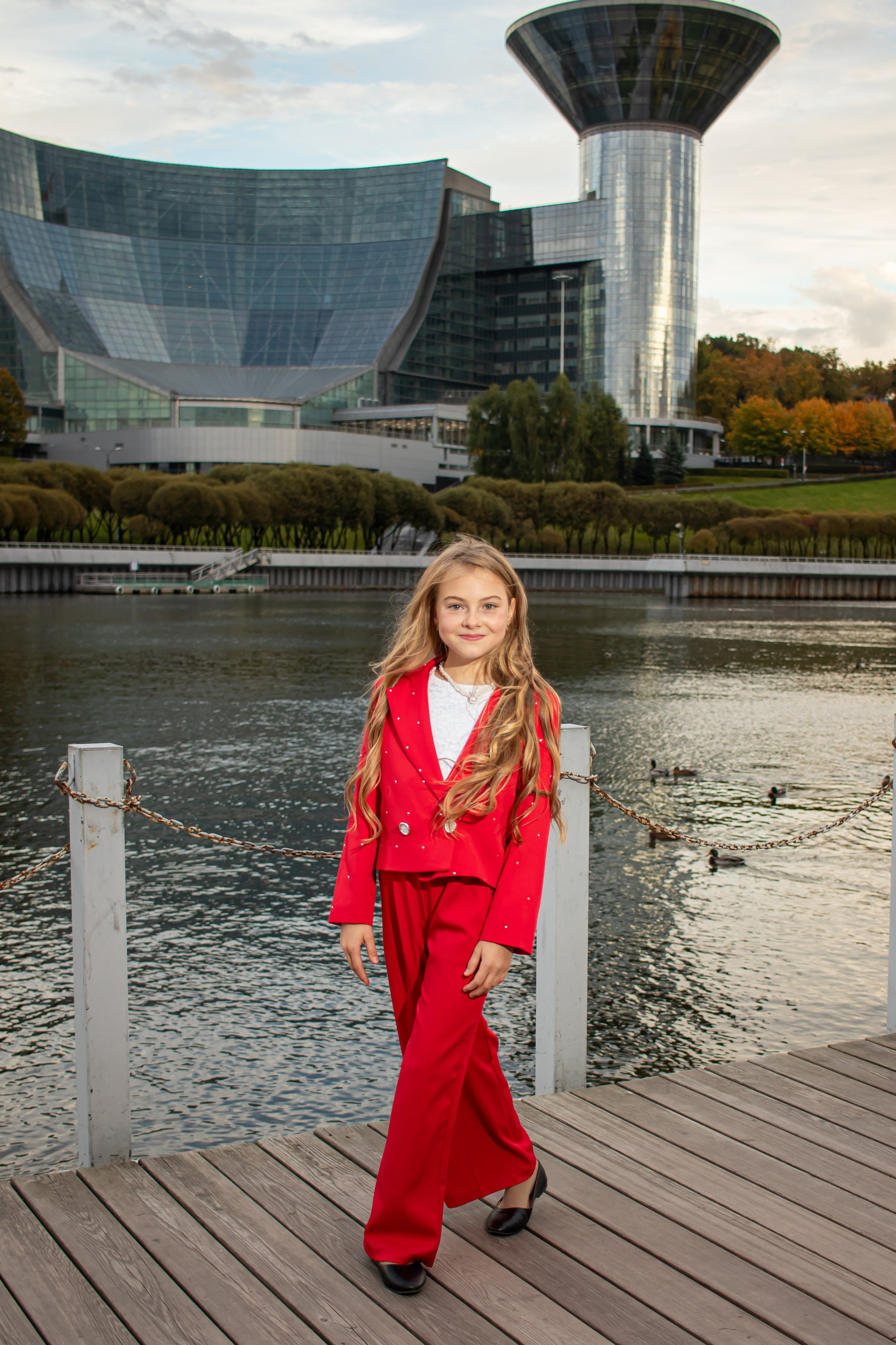 Красный костюм Виктории стал ярким акцентом среди осенних красок и городского света.